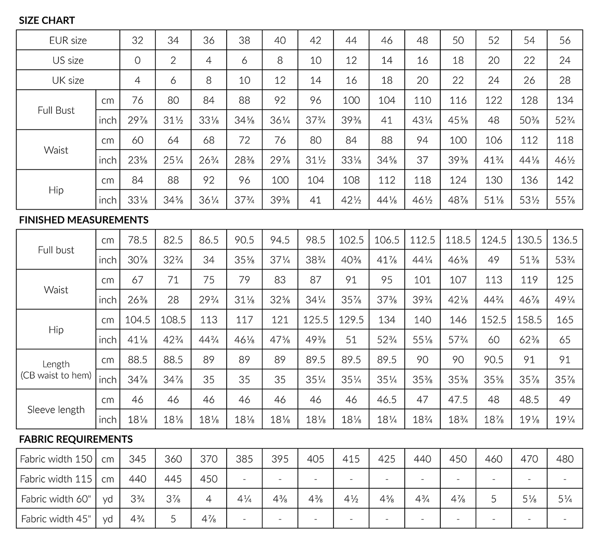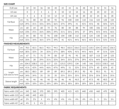 - 3.5 cm (1 3/8”) ribbon for wrap ties, 1.5 x your waist circumference + 170 cm (67”)