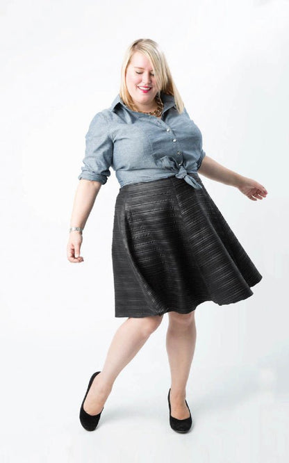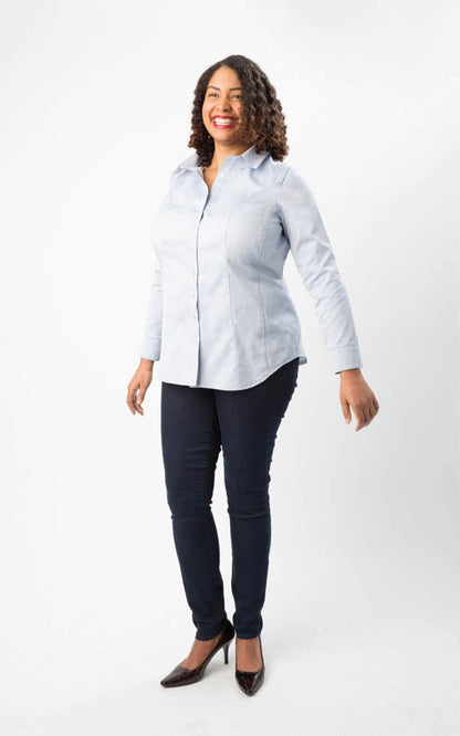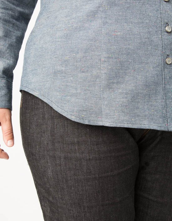 Finally, the answer to your prayers: a fitted button-down shirt that doesn't gape over curves! The Harrison Shirt is designed with three cup sizes C–H, and double princess seams for a uniquely curve-friendly fit. And there’s no need to compromise on style: the Harrison has all the features of a classic shirt, including a two-piece collar, yoke, and placket, separate button bands, and buttoned cuffs. This pattern looks equally pretty in crisp Oxford cottons at the office or cozy flannels for playing in the snow! Forget about hidden safety pins or awkwardly adjusting your shirt during the day: the Harrison has you stylishly covered.