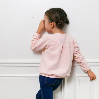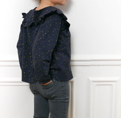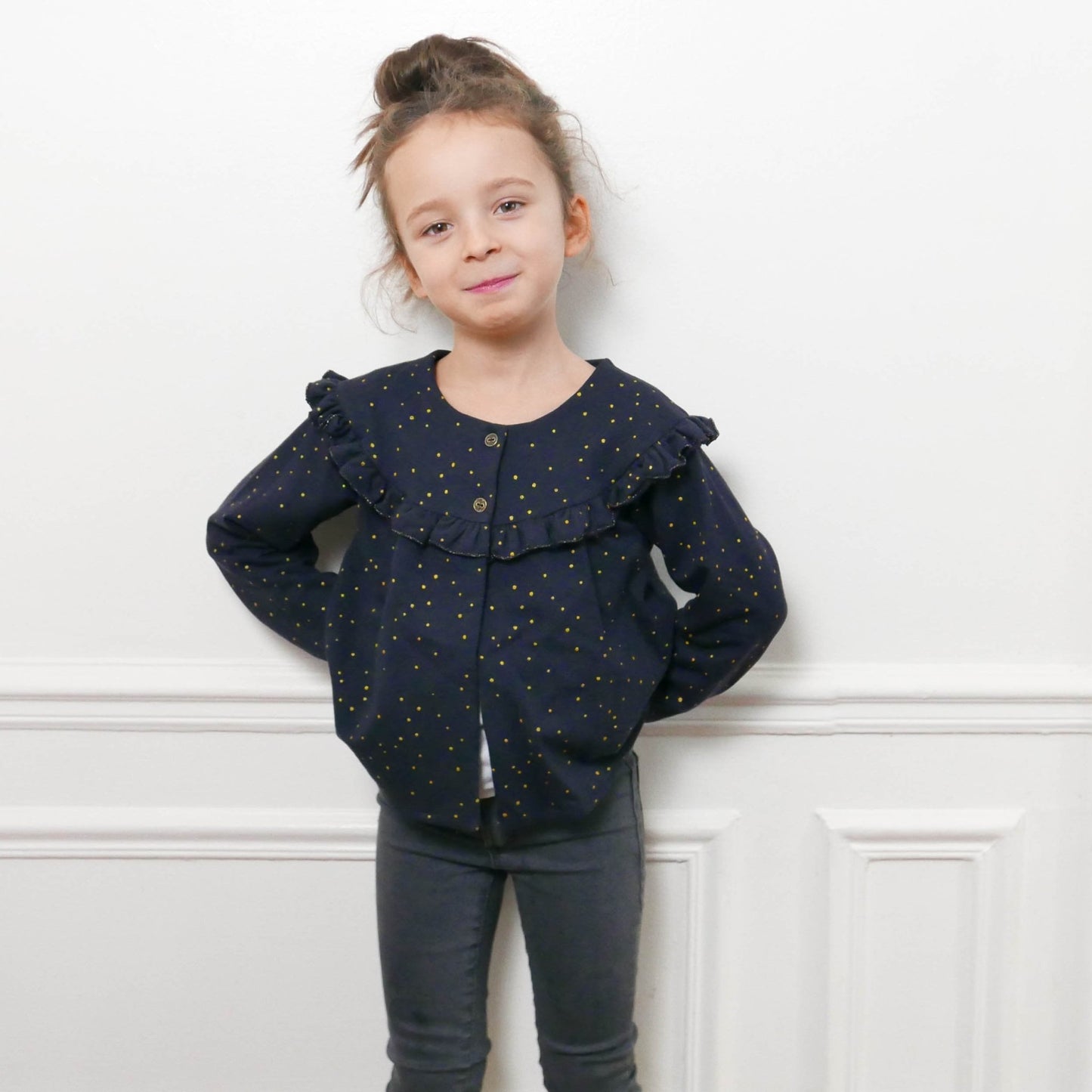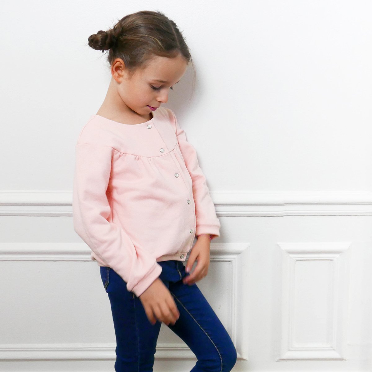 Sewing pattern for girls. Cardigan with rounded yoke and gathers. Flared with a simple hem or tucked with a band. Optional front and back ruffle, optional pockets. Complete or partial buttoning. Finishes with a yoke lining.