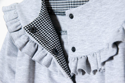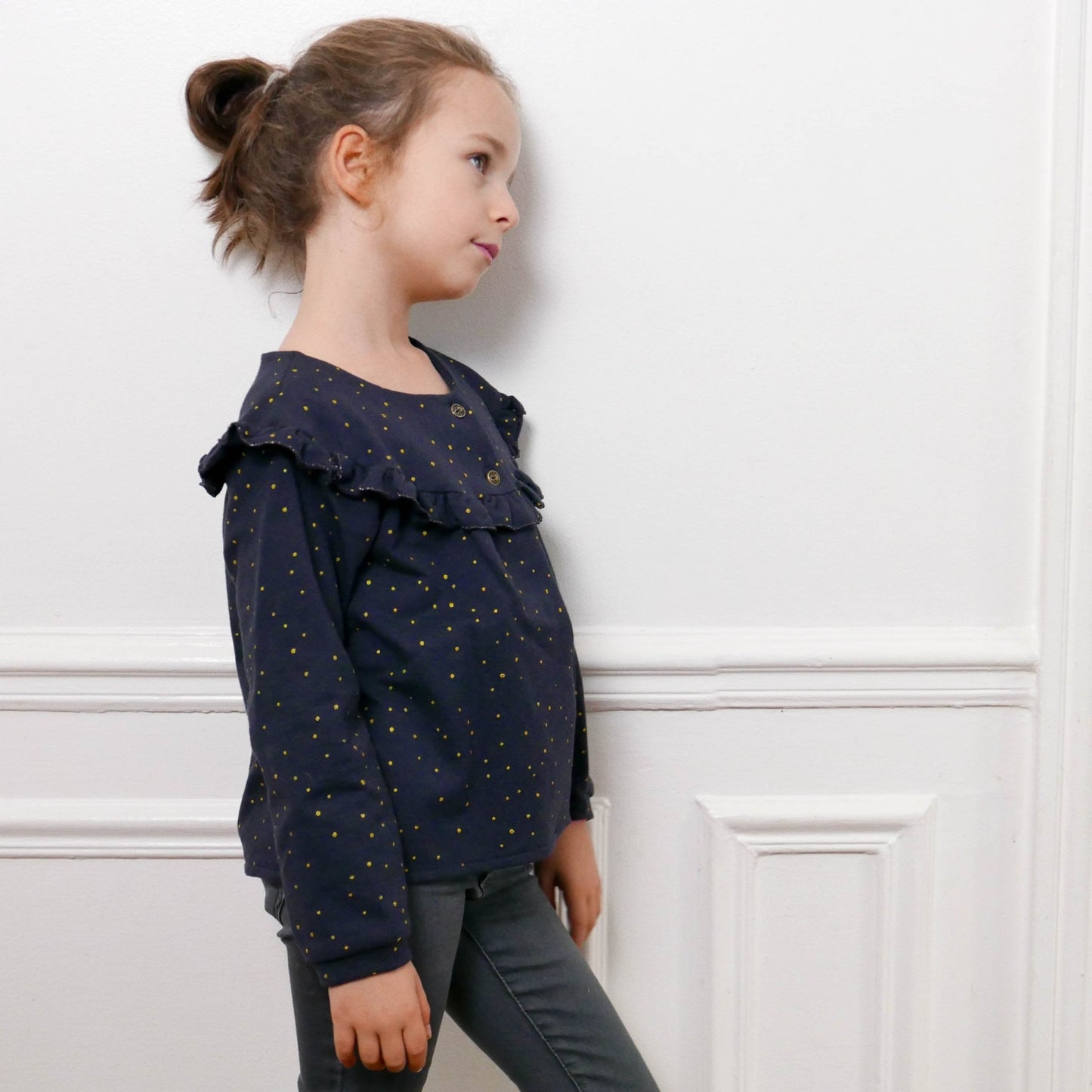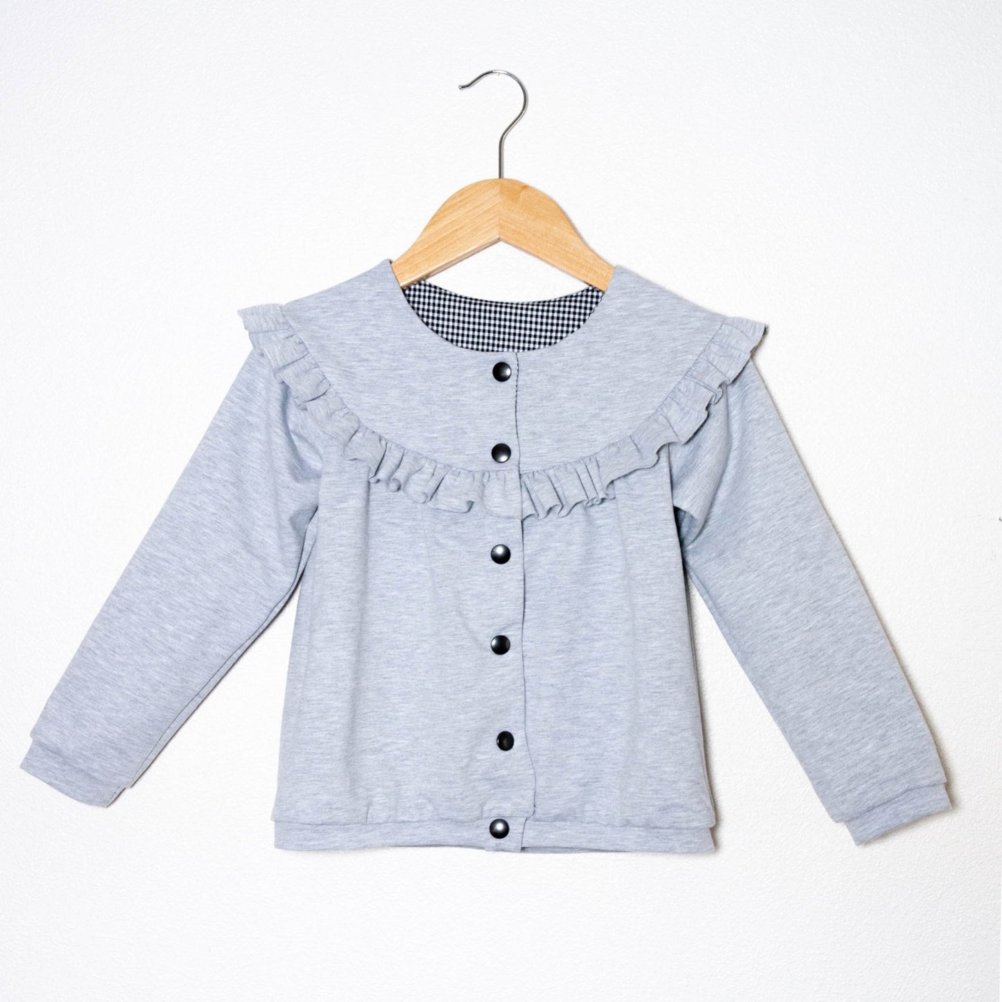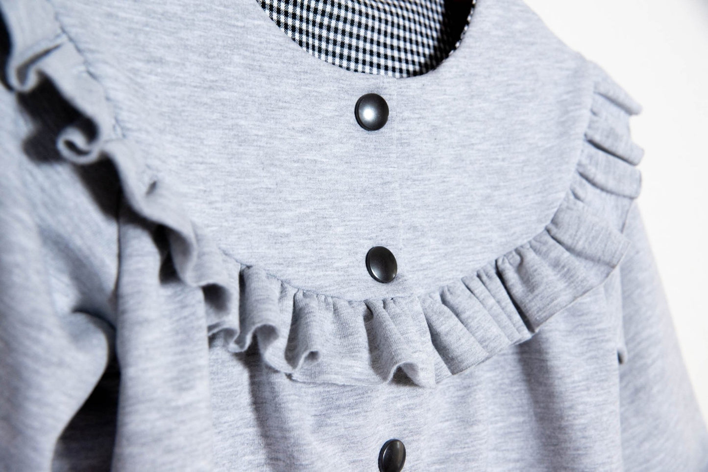 Sewing pattern for girls. Cardigan with rounded yoke and gathers. Flared with a simple hem or tucked with a band. Optional front and back ruffle, optional pockets. Complete or partial buttoning. Finishes with a yoke lining.