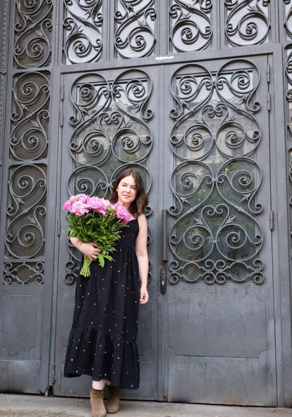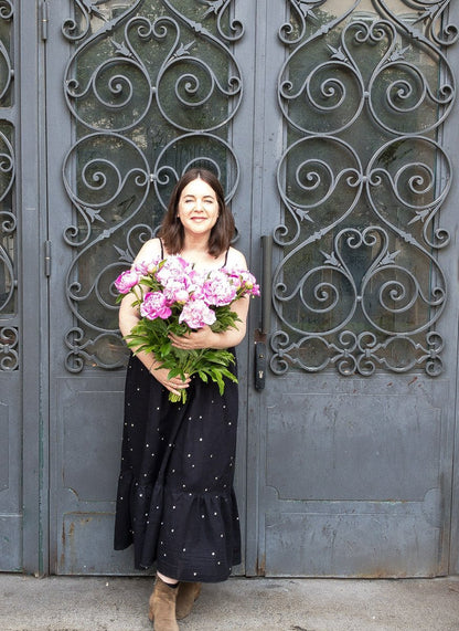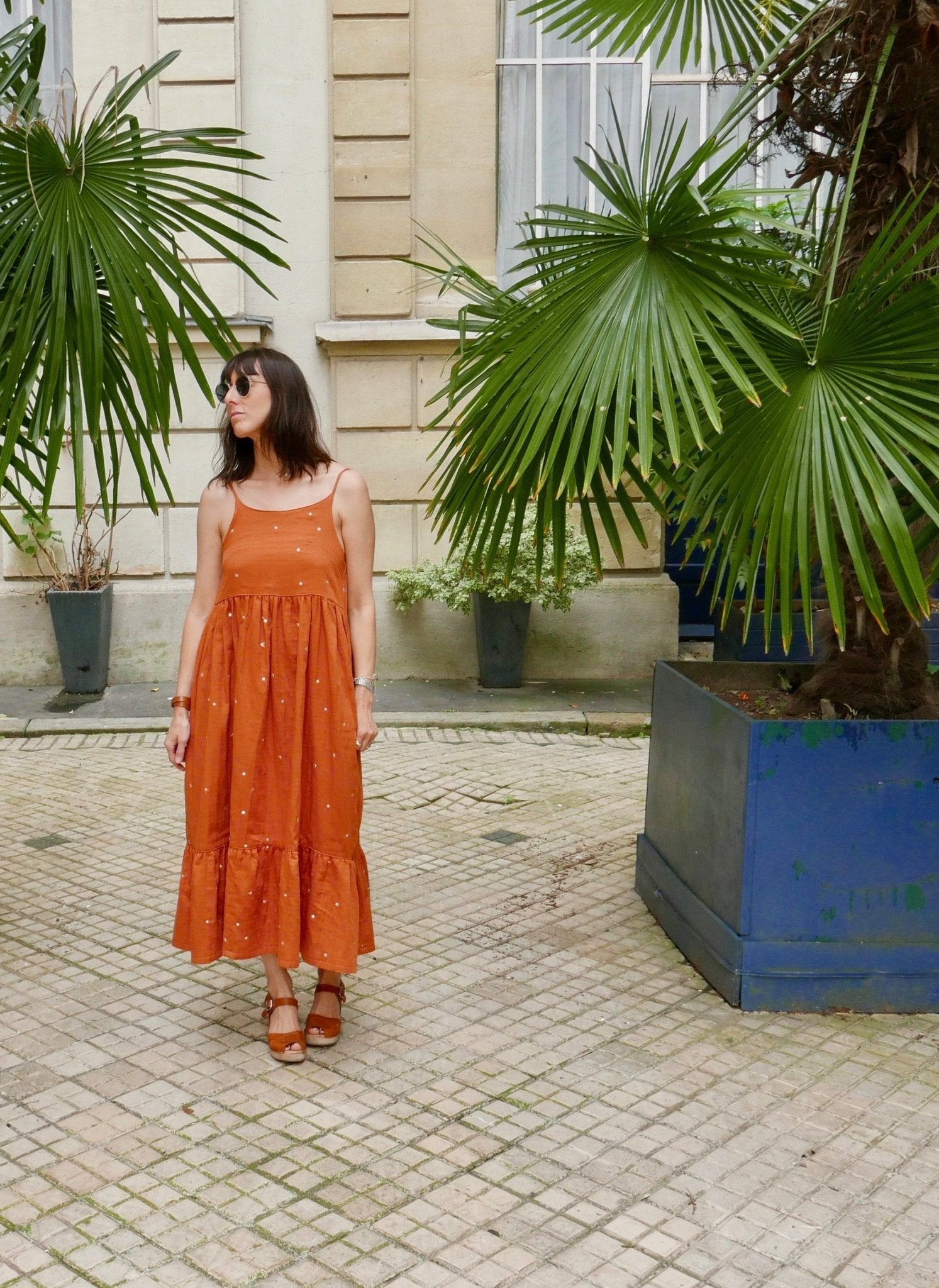 Shoulder straps at back or tied behind neck. Optional pockets for the dress only. Lining at bodice top.