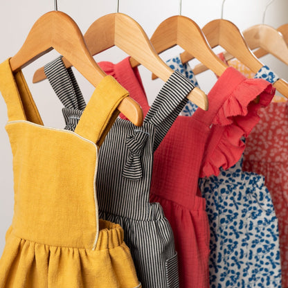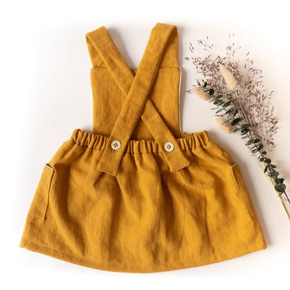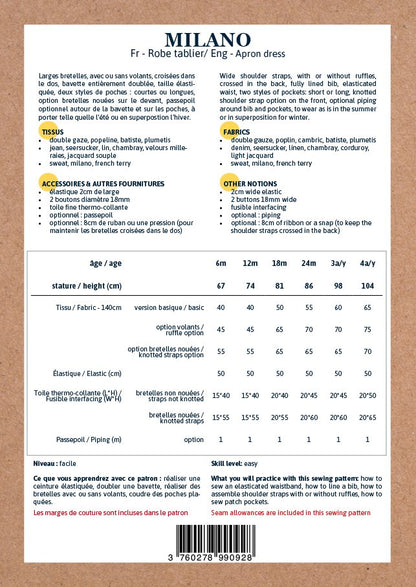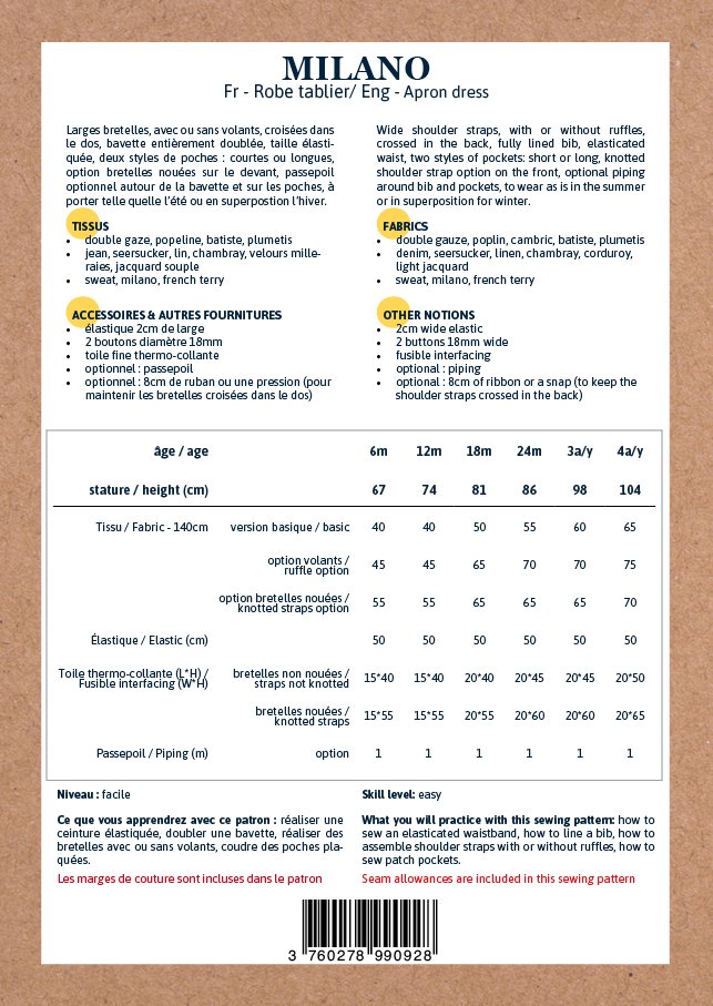 What you will practice with this sewing pattern: how to sew an elasticated waistband, how to line a bib, how to assemble shoulder straps with or without ruffles, how to sew patch pockets.