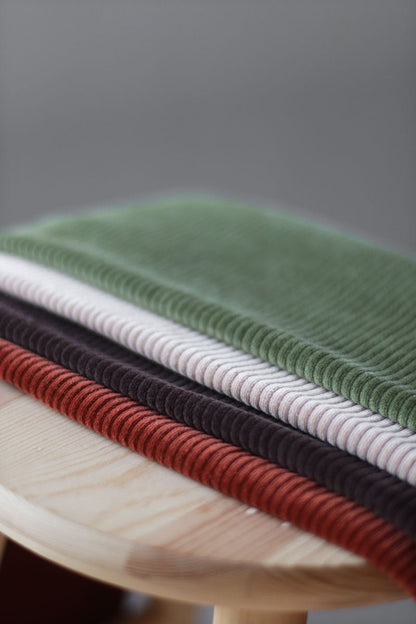 This 100% Organic Cotton corduroy velour is made with combed cotton yarns to ensure the perfect soft feel for cosy sweaters, joggers and even knit dresses.