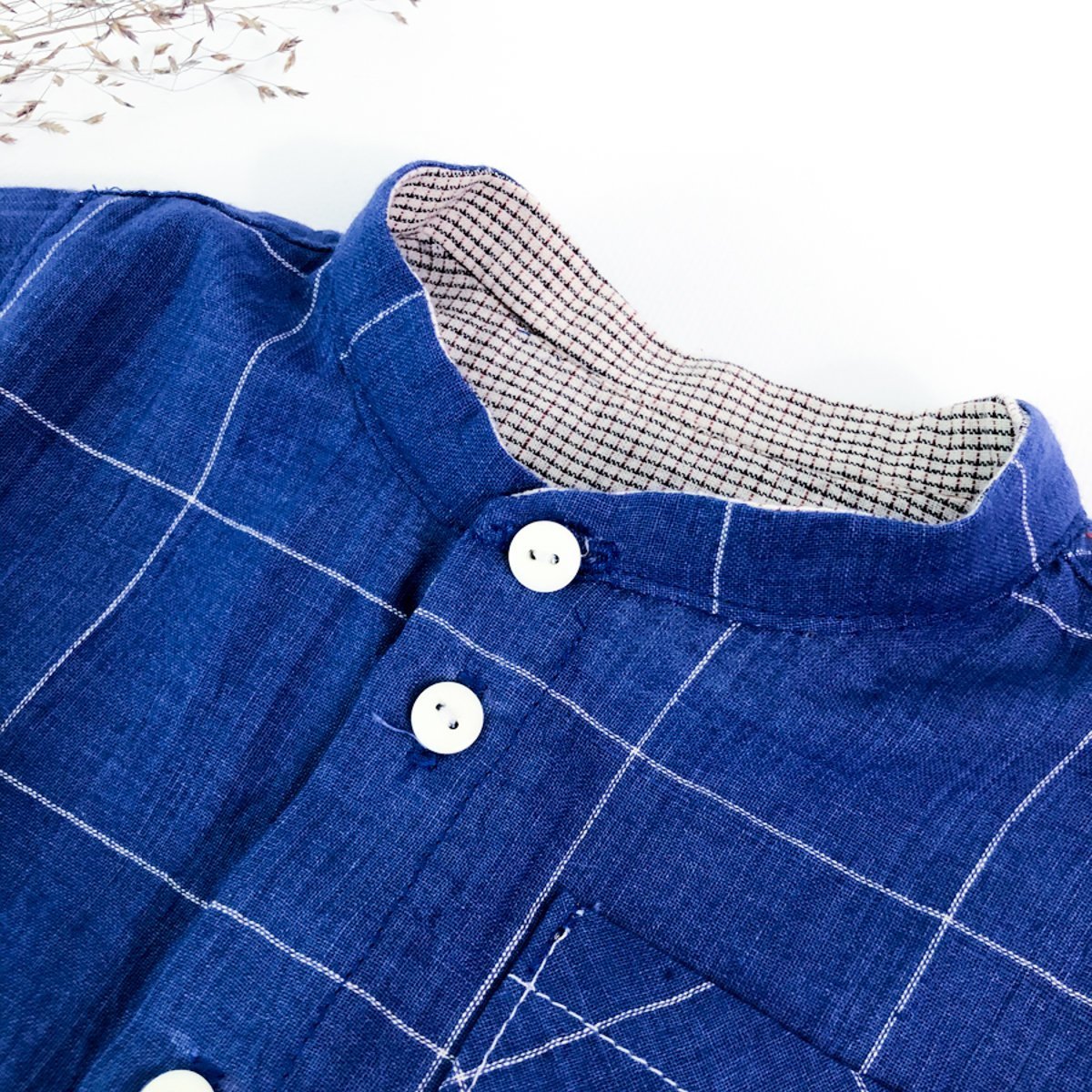 Poplin, cotton batiste, plumetis, chambray, gingham, fashioned, seersucker, cotton, linen. Cuffs, collar, back yoke and button placket linings are made of contrasting fabric (scraps can be used).. Trims: fine thermo-adhesive fabric, 10 mm buttons or snaps