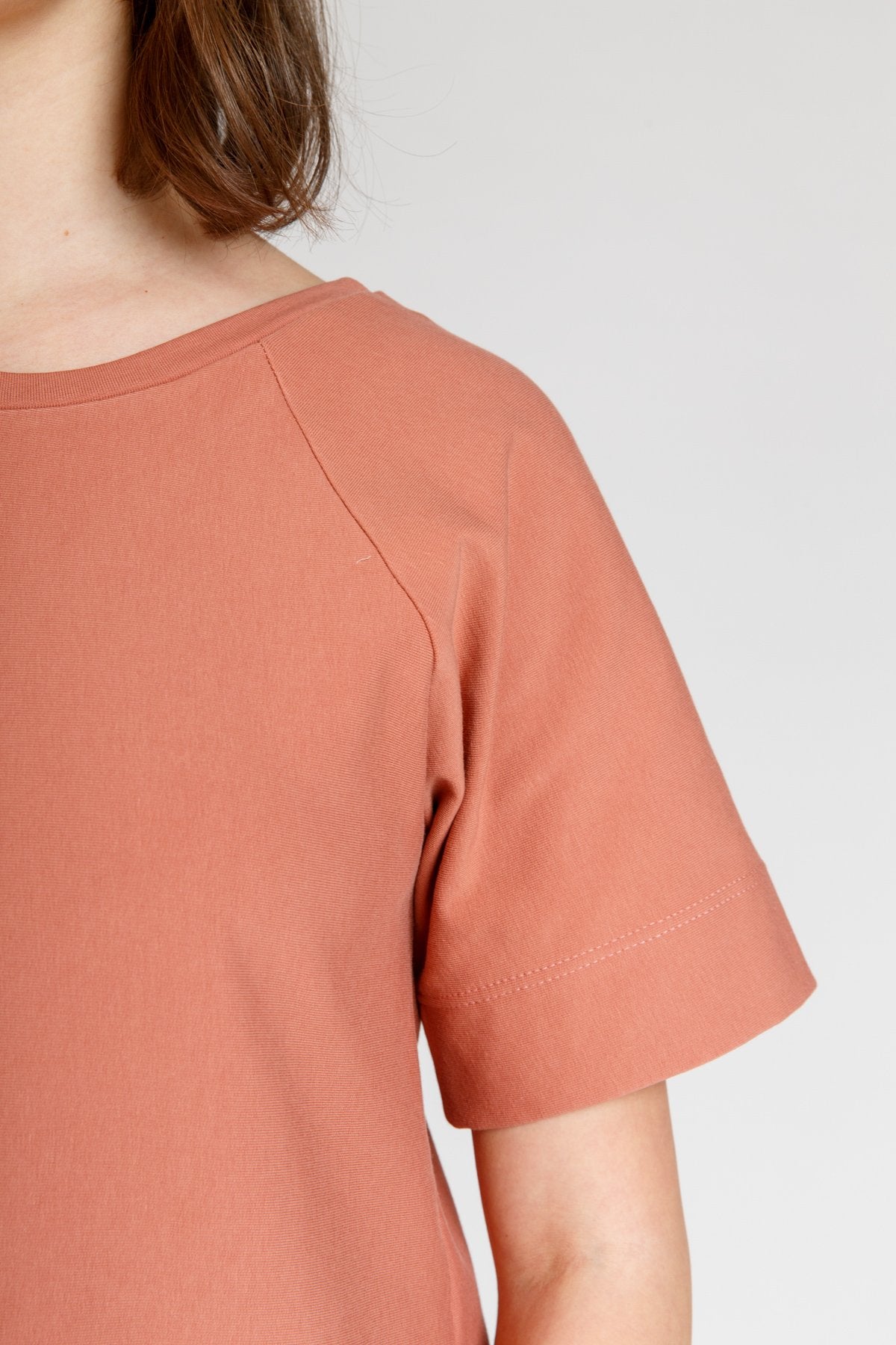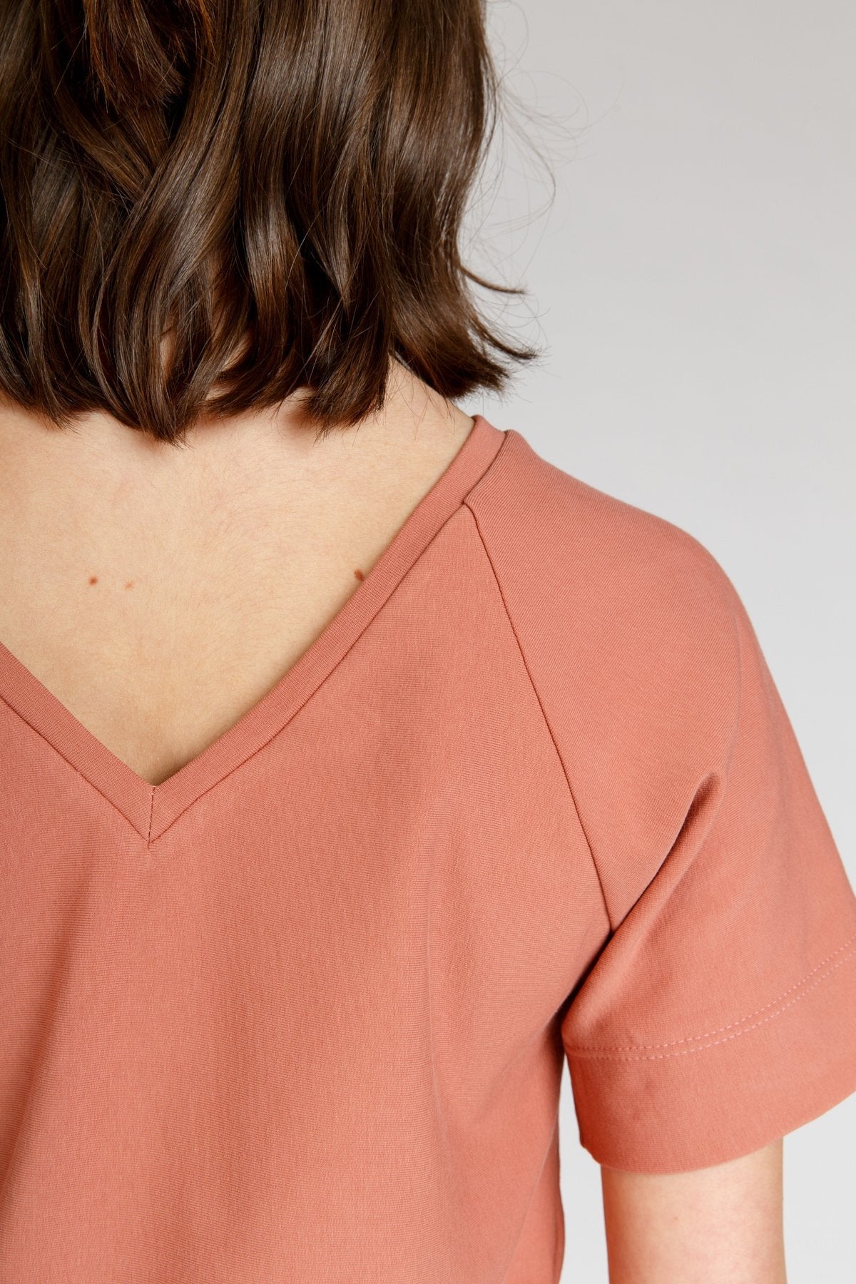 Reversible raglan dress or top that can be made in woven or knit fabrics. Pattern features loose fit, optional pockets and waist tie, as well as top and dress options. It can be worn with the V neck or the round neck side at the front.