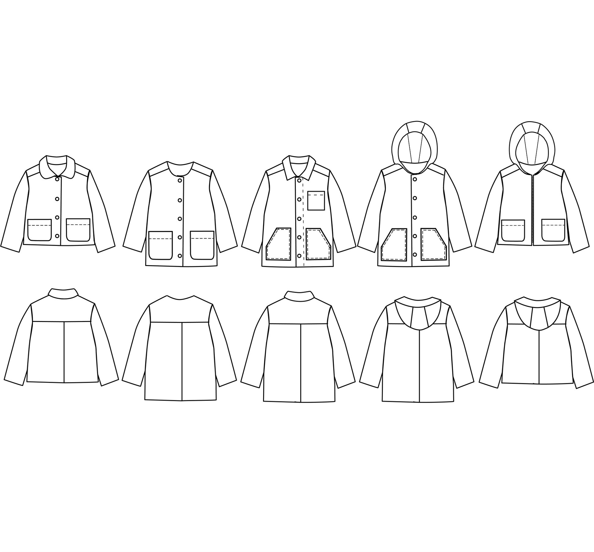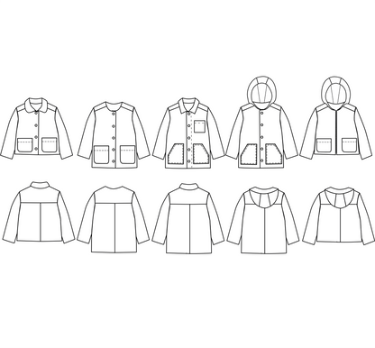 Sewing pattern for a unisex parka, jacket, coat or vest. 2 lengths: short or under-buttocks. Collar options: round neck, round collar, classic collar or lined hood. Opening options: button placket or visible zipper with facing. Pocket options: worker or round pockets, 1 chest pocket. Finishing options: lined parka or finish with open seams. Drawstring hood option. Front and back shoulder yoke.