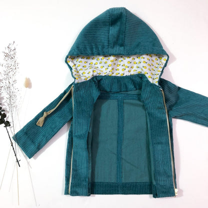 Lining: poplin or fleece/jersey for body + hood or polyester (for sleeves). It is possible to quilt lining with a padding at hood, body and / or sleeves (see the video for instructions)