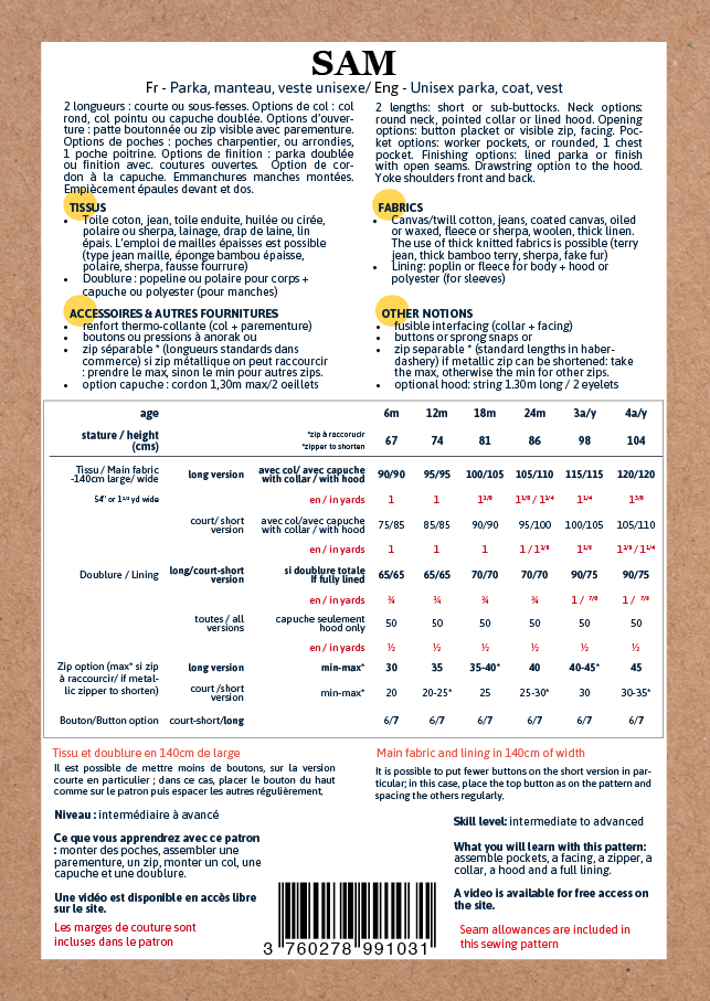 What you will learn with this pattern: how to assemble pockets, assemble a facing, a zipper, a collar or a hood and a lining.
