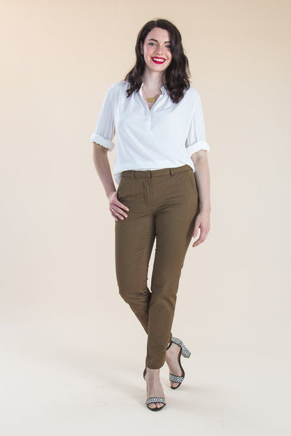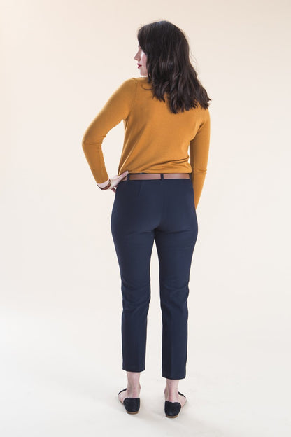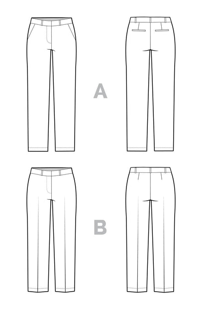 View A is a full-length pant with slashed hip pockets and a slimming pocket stay along the front, and single welt pockets at the back. View B is cropped, and omits all pockets for a sleek, clean silhouette. Both views can be sewn with optional belt loops, a hidden closure and pressed leg crease.