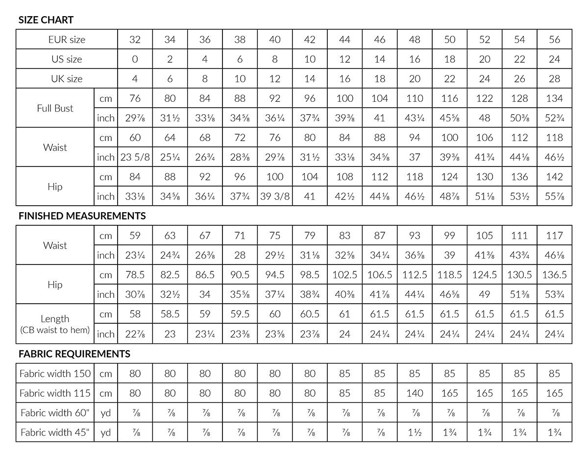 - Sizes 32–42: Fusible knit interfacing, 15 cm (1/8 yd)