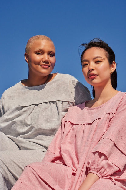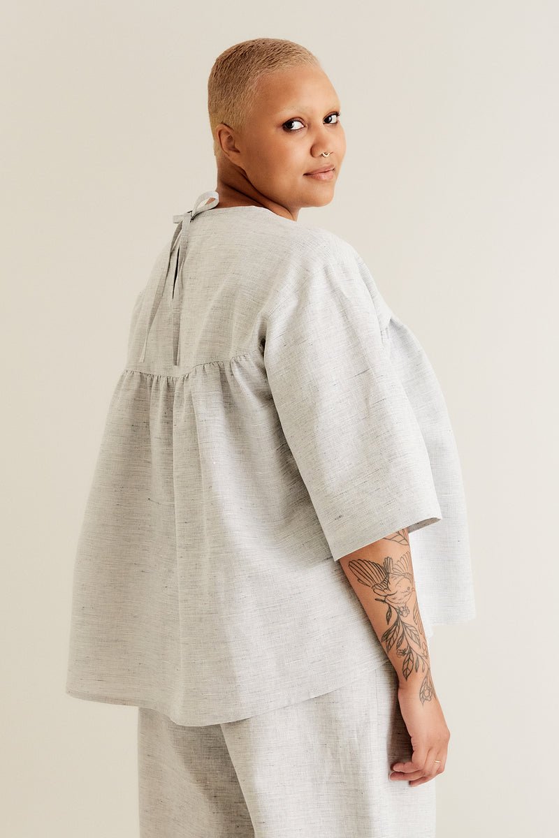 The Syli dress and blouse are relaxed everyday garments with a loose fit. Both variations feature a gathered bodice, a shallow tuck across the chest and a hemline that dips slightly longer in back. The neckline is finished with binding with a back vent secured by ties. The calf-length dress has two deep tucks around the hemline of both the skirt and sleeves as well as in-seam side pockets. The ¾-length sleeves of the dress have gathered ends finished with binding and ties. The blouse is hip length and has straight ½-length sleeves with turned hems.