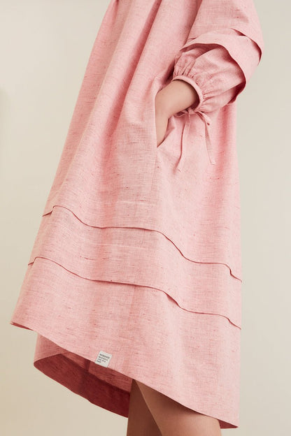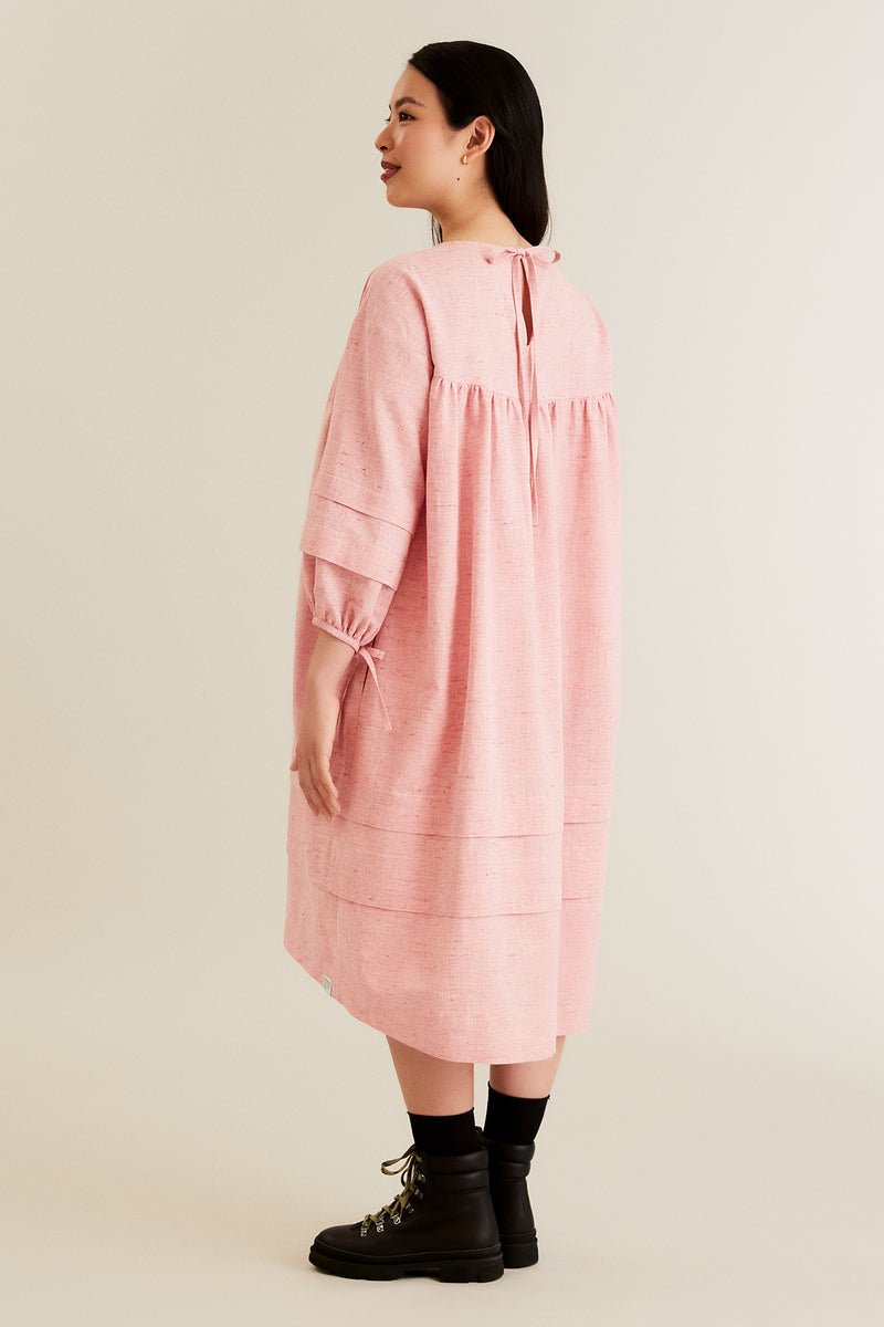 The samples were sewn from our Roosa and Sini rescue melange cottons. You can cut the binding from your fabric or choose a premade binding. If your fabric is light or drapey, interface the pocket openings of the dress using fusible interfacing.