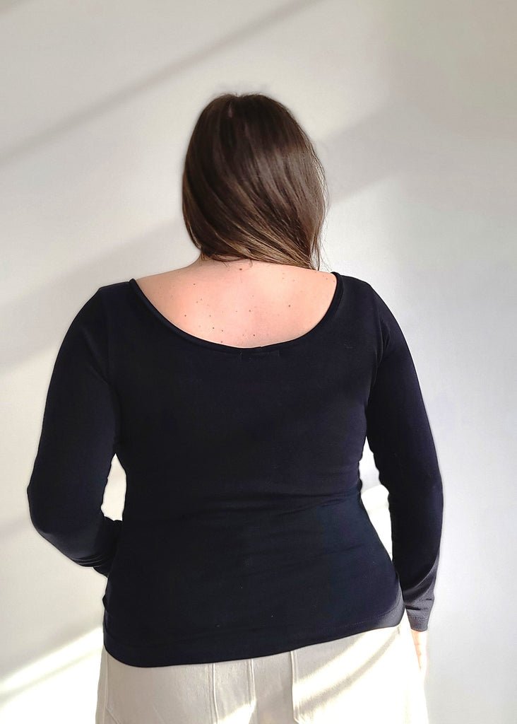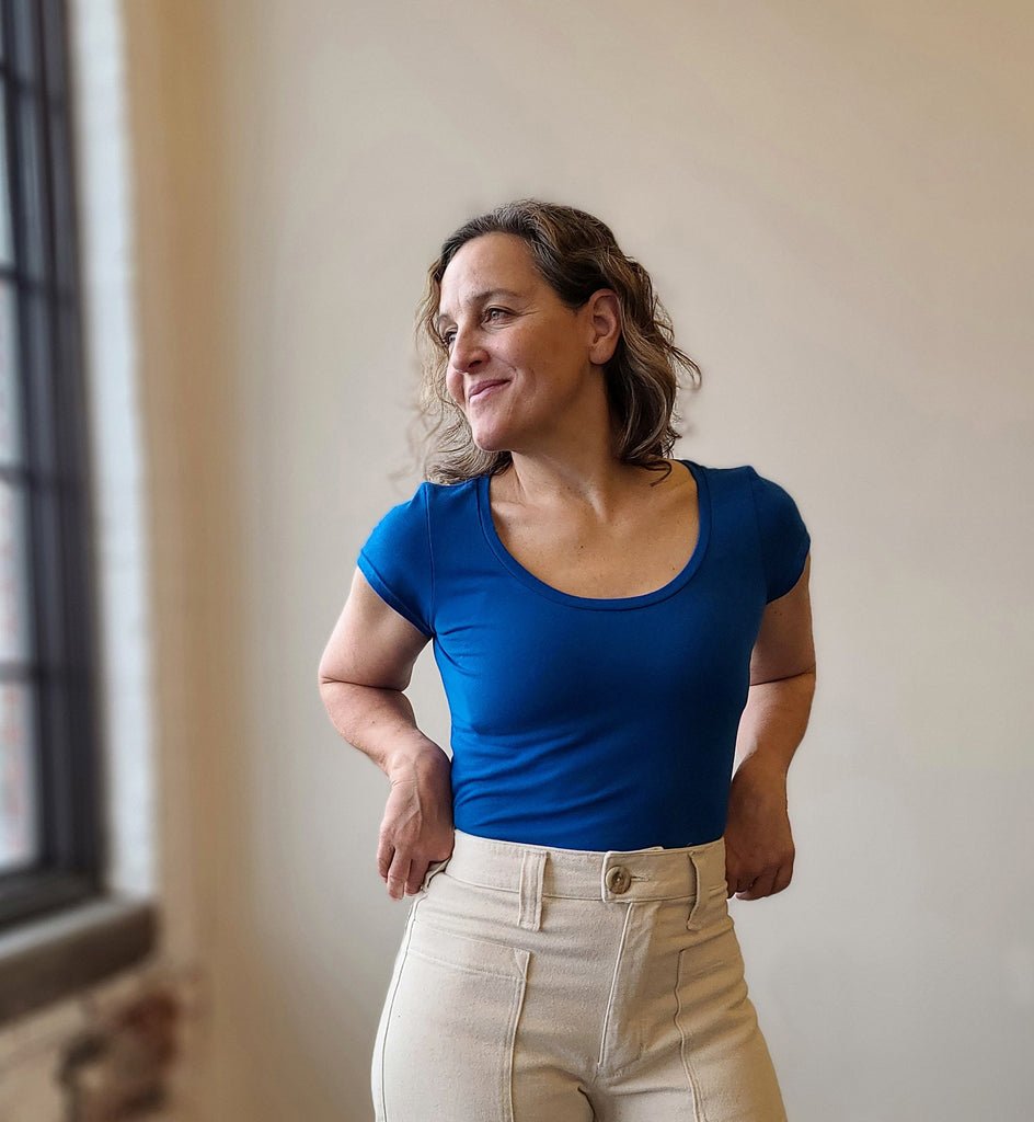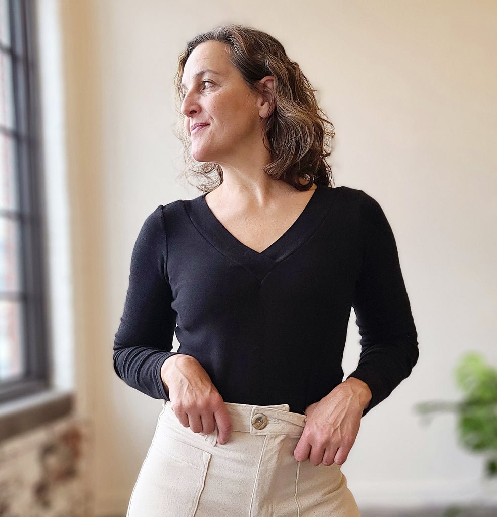 The Skyline Tee is a classic, body contouring t-shirt that includes five different necklines and four different sleeve options that can be interchanged to make a t-shirt for every season and occasion. Choose between a full length hem or a cropped hem. This pattern has been designed for use with stretch knit fabrics with at least 50% vertical and horizontal 4-way stretch.