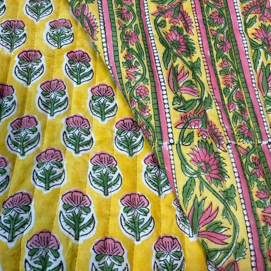 Petal Path Pink + Floral Sunshine Buti - Quilted Bagru Indian Cotton Block Print (Reversible)