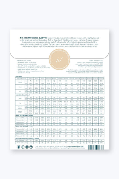 The Aina pattern includes two variations: Classic trousers with a slightly tapered ankle-length leg, and trendy culottes. Both of these lightly fitted trousers have a high rise, fly zipper closure, front pockets and patch pockets in the back. The front waist is finished with a classic and clean waistband with a decorative button closure at the sides. The back waist has a relaxed elastic detail, making the trousers more comfortable and easier to fit. Either variation can be sewn with or without the decorative top stitchings.