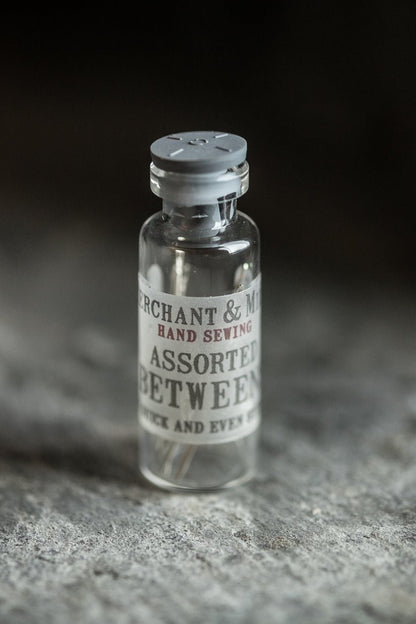 More widely used in quilting nowadays but still the best needle choice for easy handling when sewing hems. A mixture of 10 slightly different sizes encased in a Merchant & Mills glass vial with rubber stopper.
