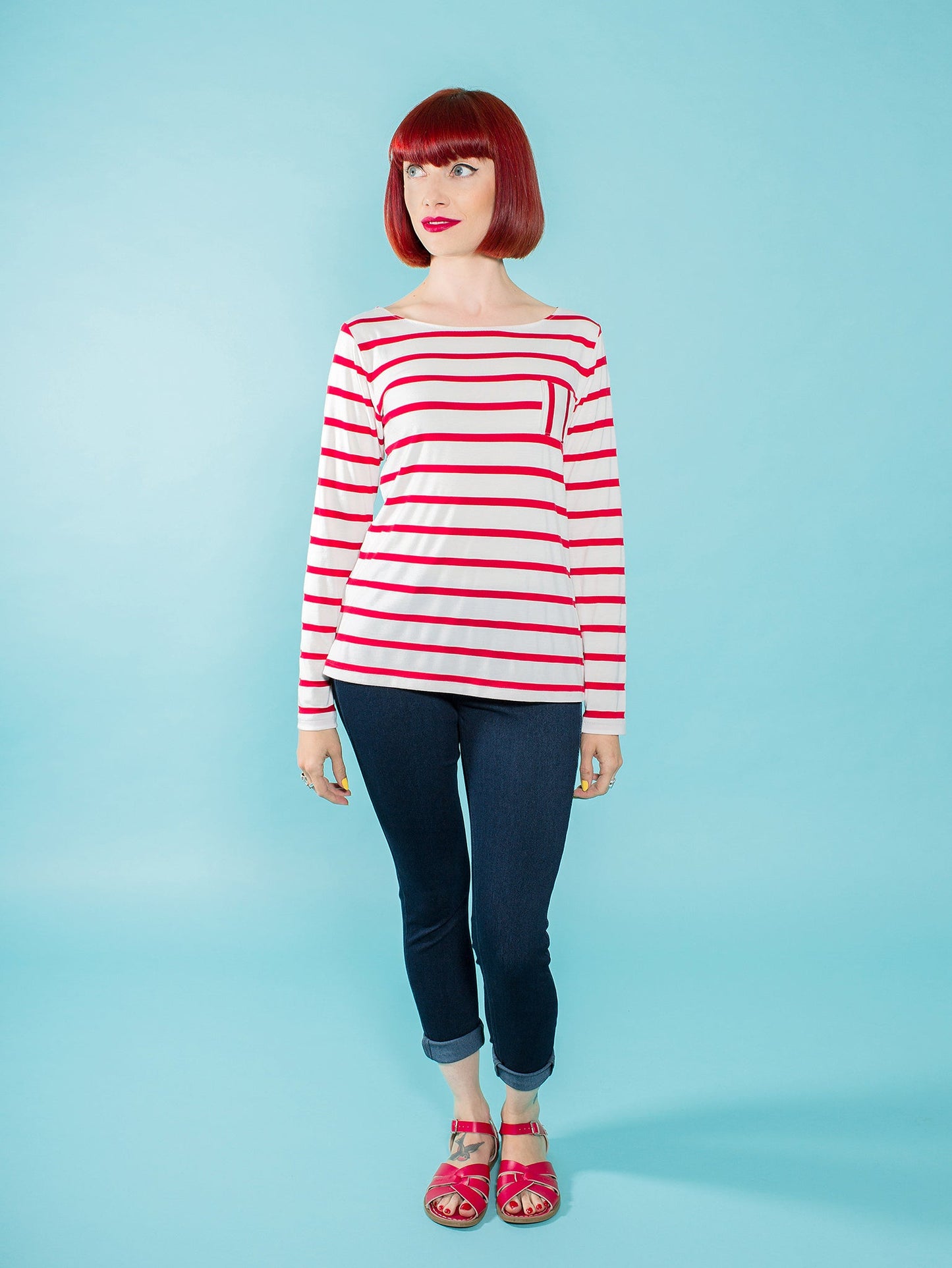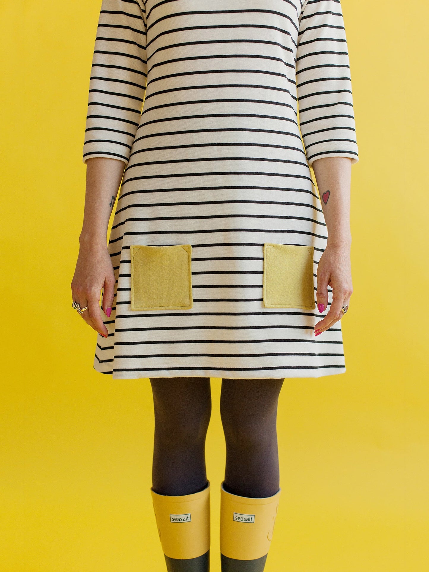 Fill your wardrobe with classic Breton tops, cosy knit dresses and sixties-style funnel necks - all from the same pattern and no overlocker or serger required! Choose from top or dress length, boat neckline or funnel roll neck, long or three quarter sleeves with optional rolled cuffs and patch pockets.
