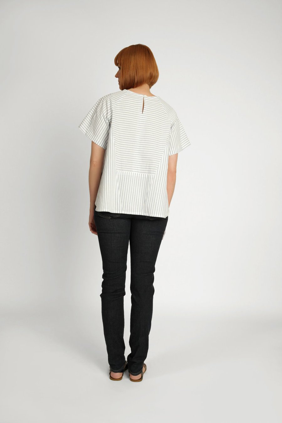 The Collins top is a loose-fitting trapeze-shaped top designed for woven fabrics. It is A-line in shape, perfect for hot summer days. It features a round neck, panel lines, a high-low hem and a centre-back opening, with a button and loop closure. Due to its length, the Collins top is the perfect top to pair with skirts or trousers that sit on or above the natural waist.
