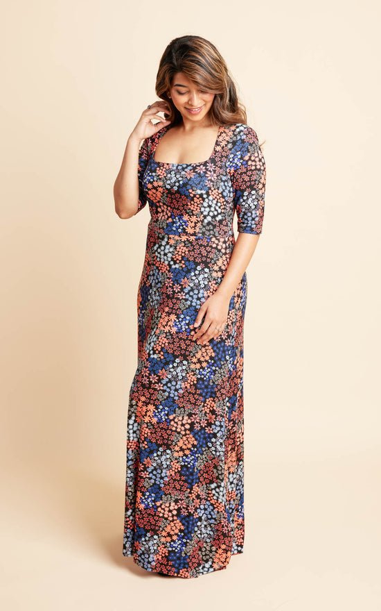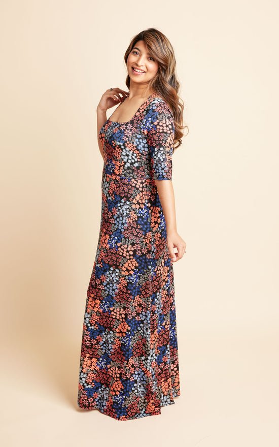 Megha (floral dress, fuchsia top) is wearing a size 4 C/D graded to a 6 waist and 12 hip. Her measurements are high bust 32", full bust 34.5", waist 28", and hip 42", and she is 5' 2”.