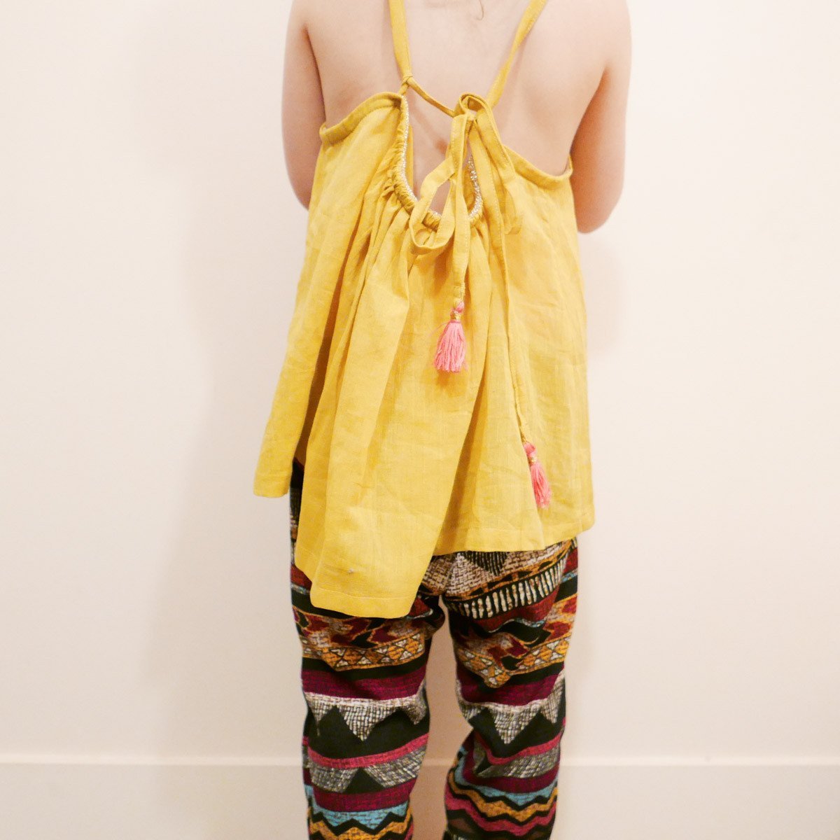 Arm straps with knot at back.