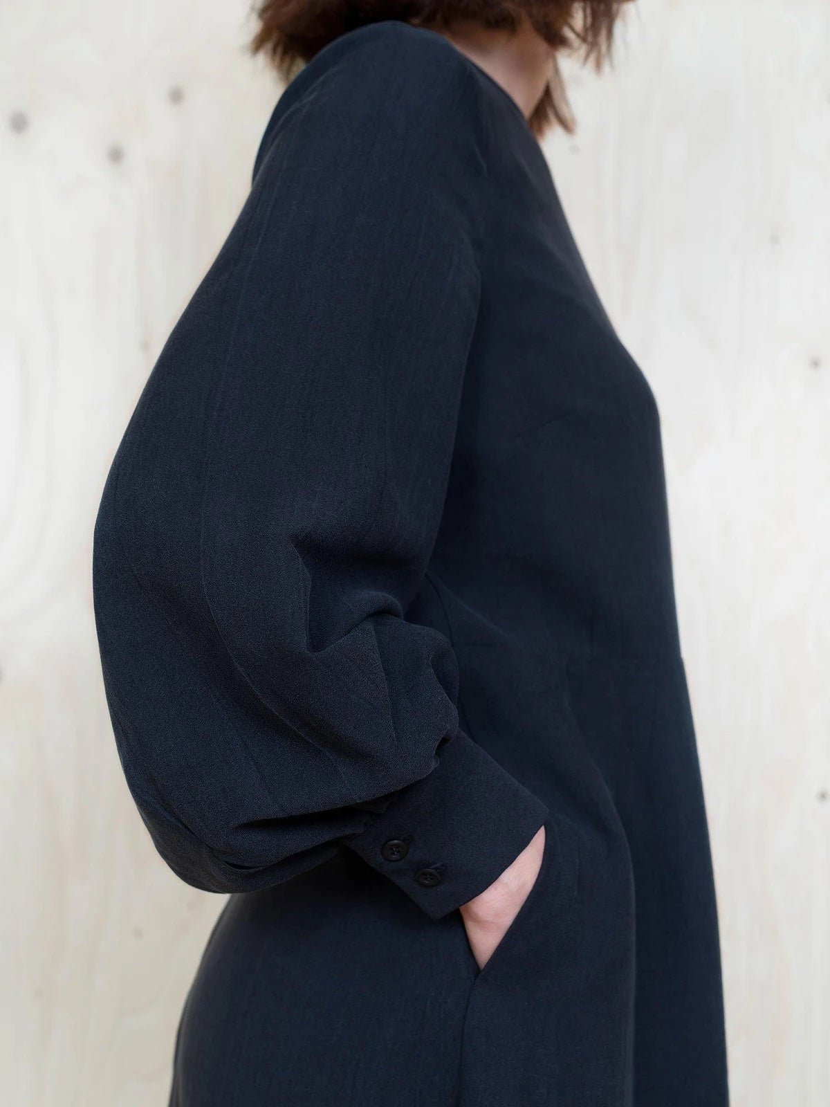 A dress with a classic silhouette, a round neck, a concealed rear zip and inseam pockets. The magic occurs when you put on the sleeve of your preference. The pattern features a basic long sleeve, a puff long sleeve with button cuff and a 3/4 box pleat sleeve with a cuff as well as a sleeveless version.
