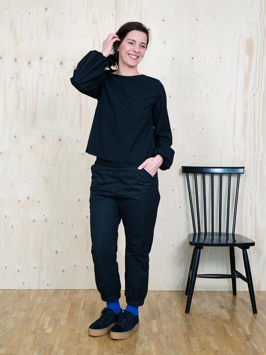 The Puff shirt has overlap shoulders. Sleeve bottom is wide and gathered with elastic tape folded inwards which creates a puff sleeve.