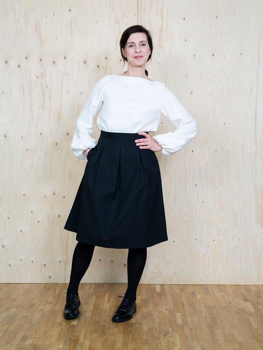 The white shirt is styled with our Three pleat skirt and the black shirt is combined with the Almost long trousers.