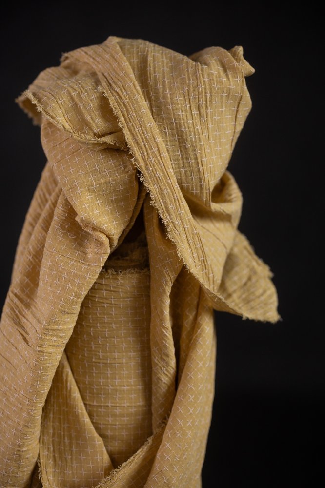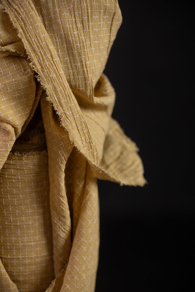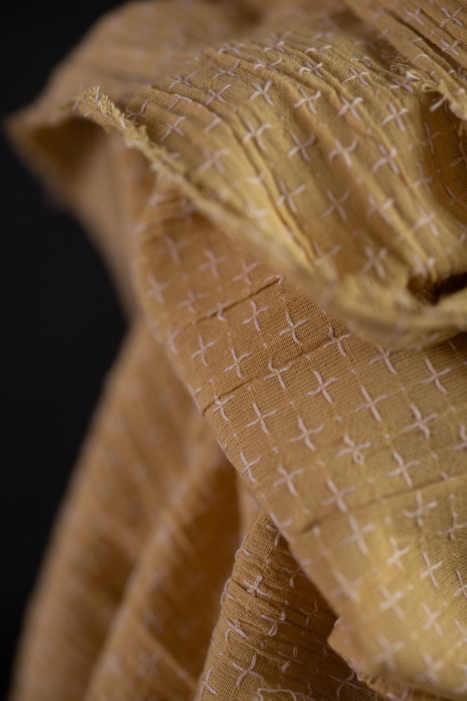 A unique Indian cotton with a crinkled gauzy texture in a pale yellow with cross stitch detailing in pale pink.