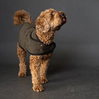 Oilskin, dry oilskin, cotton jacquard, mid – heavy cotton canvas or twill, mid weight denim or corduroy. For the lining we would suggest barrier lining or a simple stable cotton. Consider if you will want to put this dog coat in the washing machine when choosing cloth – for example oilskin cannot be washed – you would let the dirt dry and then brush it off.
