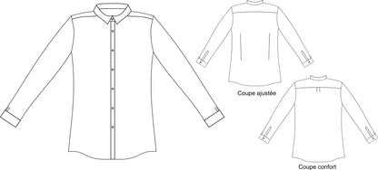 It is a rather cut to fit shirt but we suggest two options to make it either more fitted ( thanks to the back darts ) or more comfy ( 2” box pleat in the middle of the upper back ).