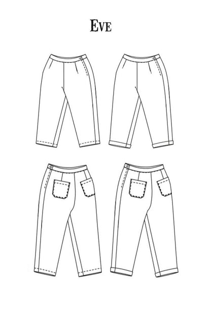 The Eve Trouser is cropped, with a slightly tapered leg and optional turn ups. It’s an easy garment to make, fitting neatly at the waist and over the hips with a simple side zip and two back pockets. Choose to make pleats or darts into the waist seam.