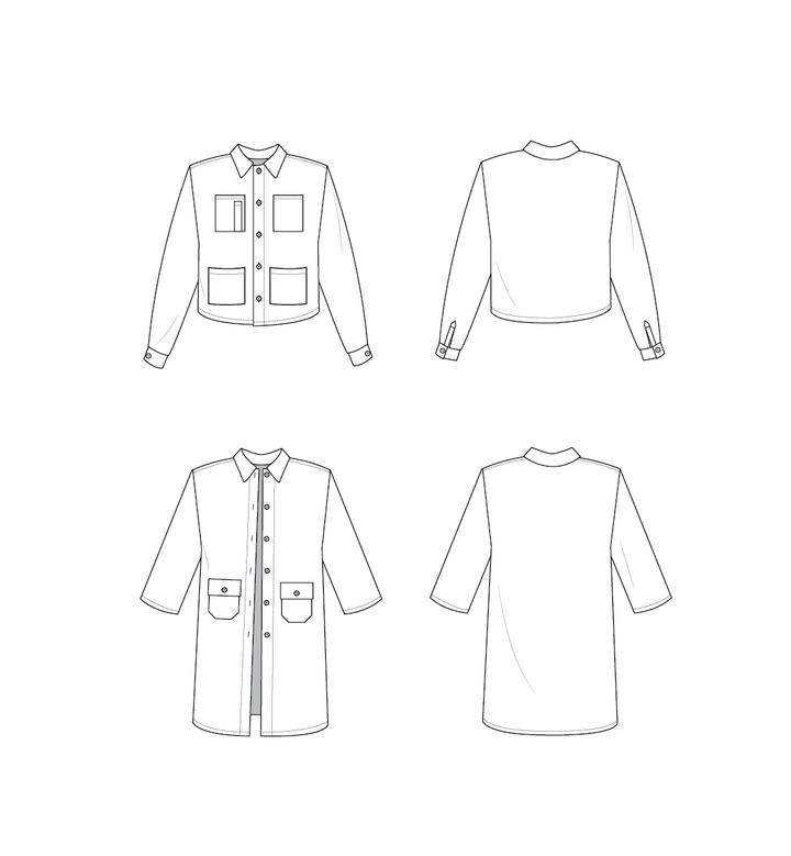 It features drop shoulders and comes with two sleeve options: a placketed sleeve with cuff, and an easy to sew boxy sleeve for a more relaxed vibe. It also includes two lengths as well as a bunch of pocket templates that you can mix and match! The possibilities are endless! You can wear the Ilford as a jacket or shirt depending on the fabric you use. This is a fun, skill building pattern that you will want to make/wear again and again! This pattern is for everyone and looks great on all genders!