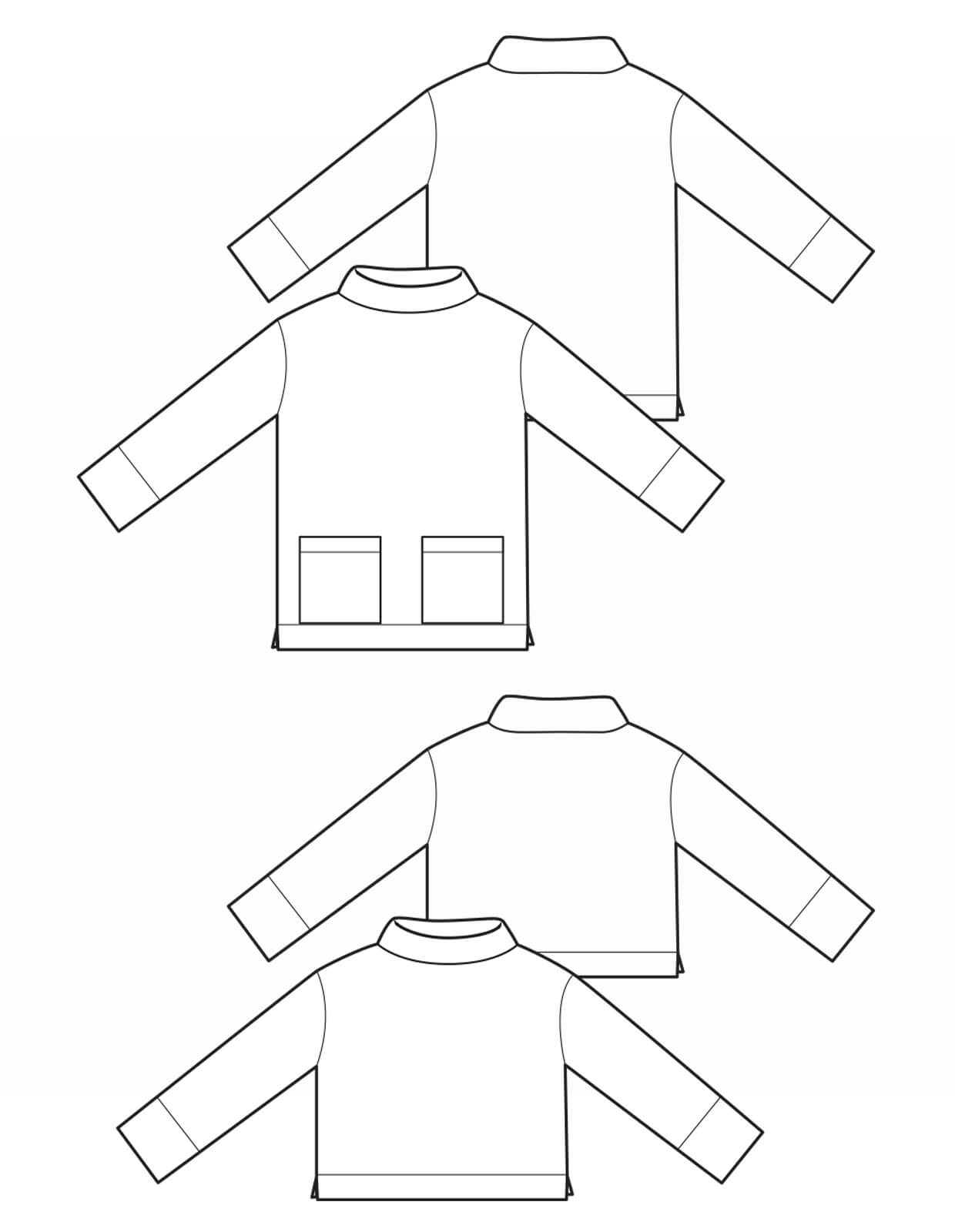 A roomy pull-on top in two lengths, both with stand collar. The longer length has two front pockets.