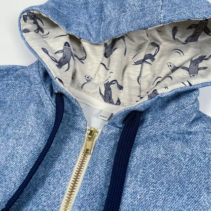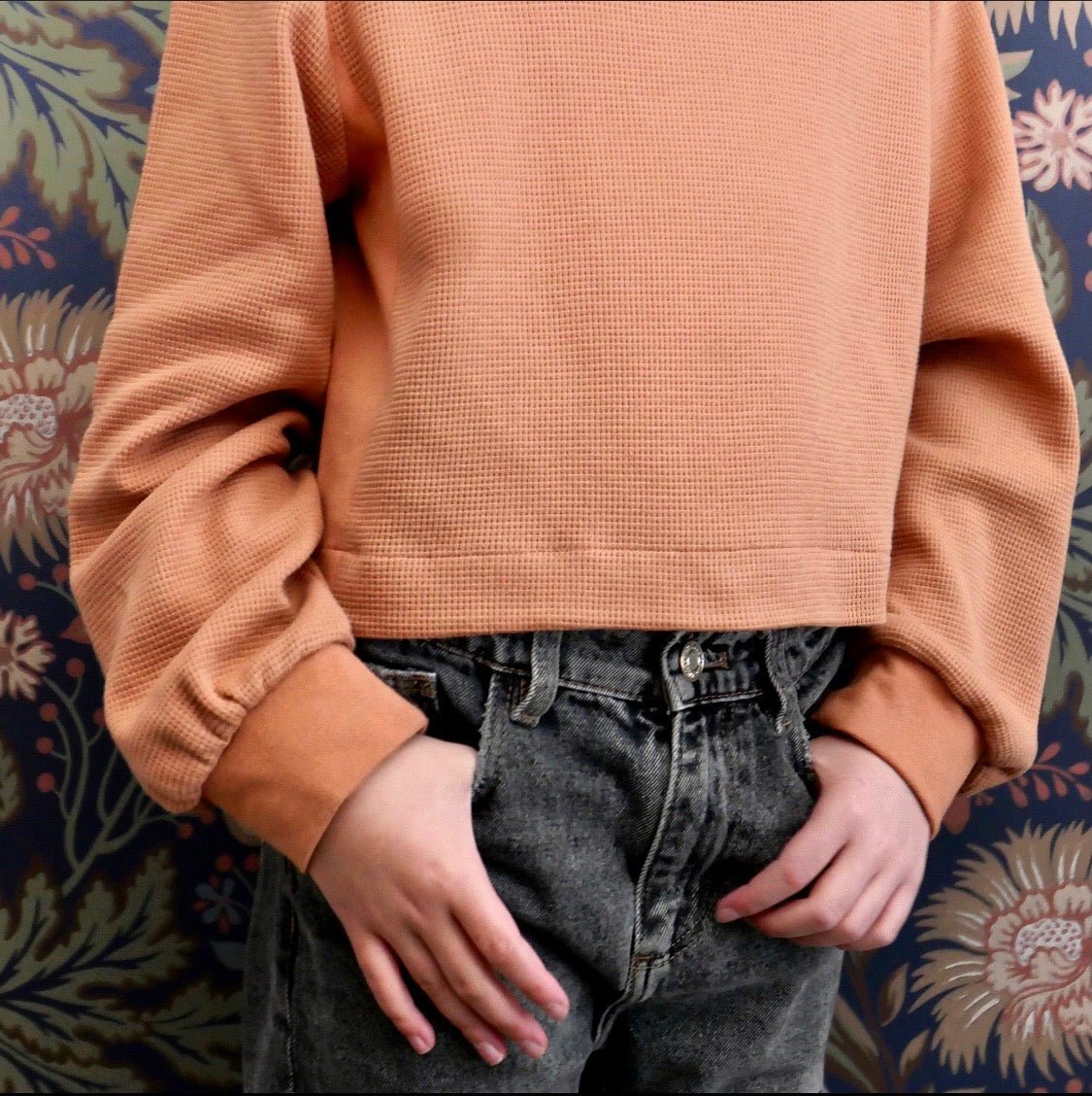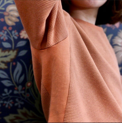 Outer: French Terry, fleece, sherpa, jersey, ribbed knits, fancy knitted fabrics such as waffle or terry . Hood lining: jersey, cotton poplin or chambray. Cuffs + neckband (hoodless version): ribbing