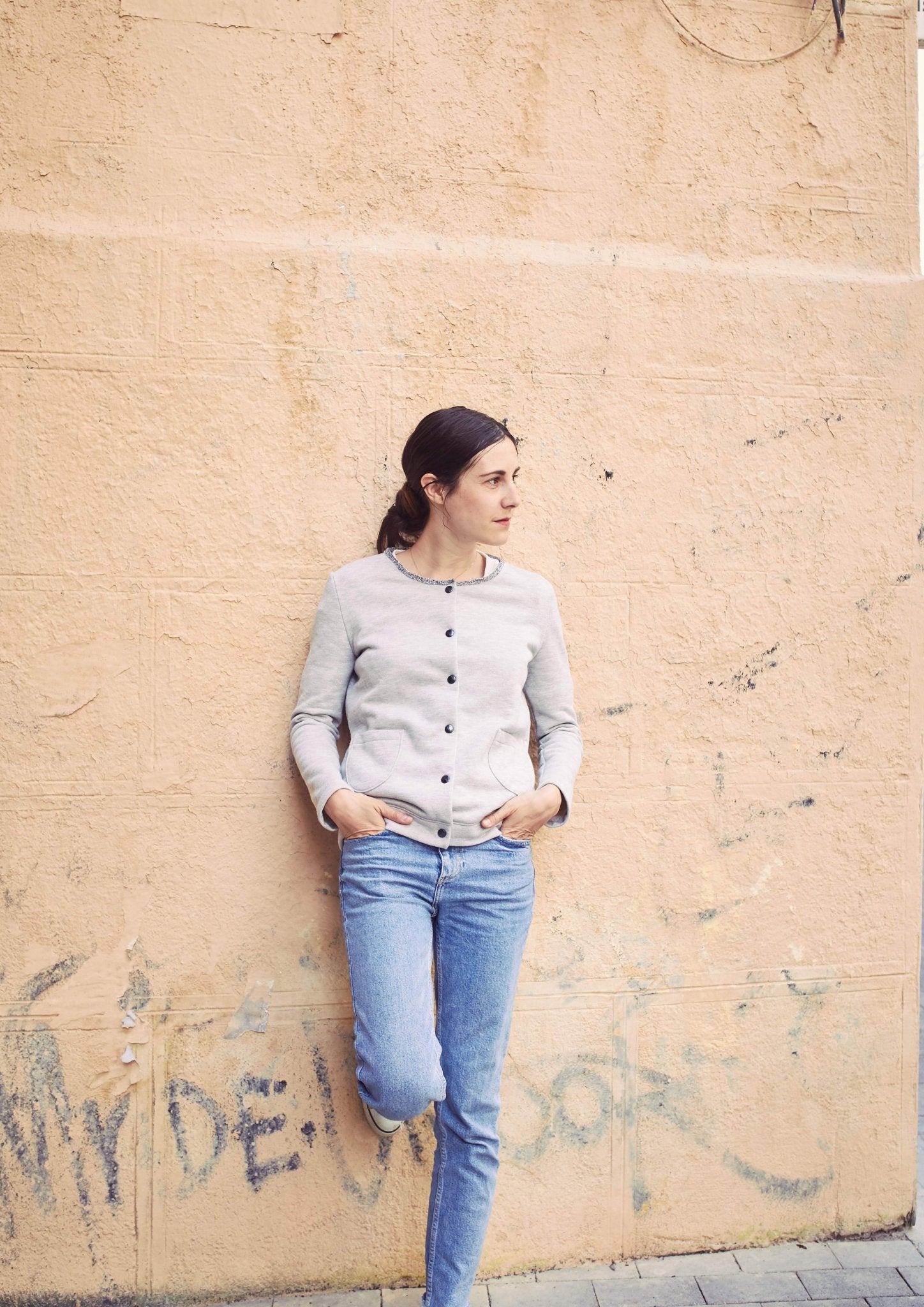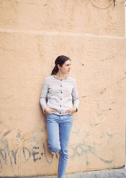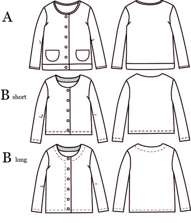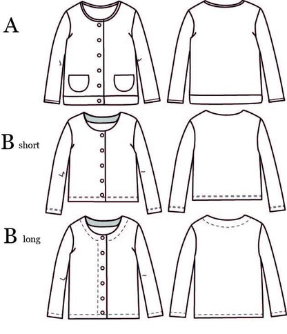 Comfortable cardigan. Straight cut. 2 versions A or B. 2 options at lower body: hem or body band.2 lengths: mid-hips or mid-buttocks. 2 neck options: with bias binding or facing.Buttoned front. Optional round pockets applied.Cuffs with hem or bias binding.2 timeless versions.