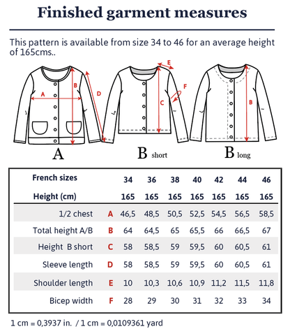 The sewing pattern is proposed in French sizes  34, 36, 38, 40, 42, 44, 46 which corresponds to specific measurements. Please see standard measurement guideline (in cms). Standard heigth is 165cms.