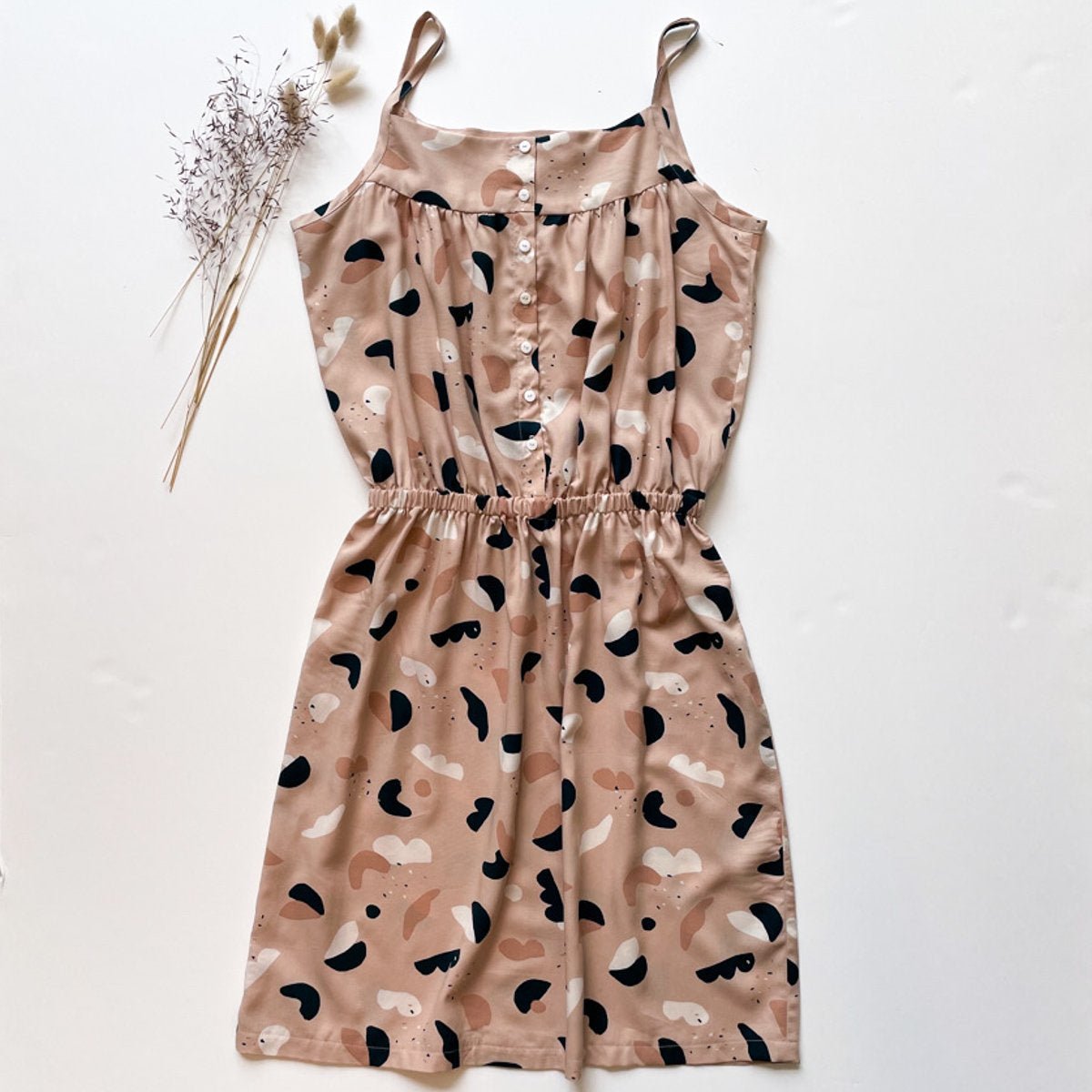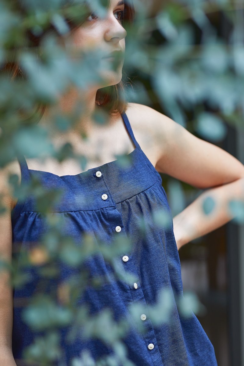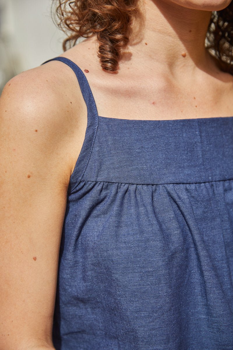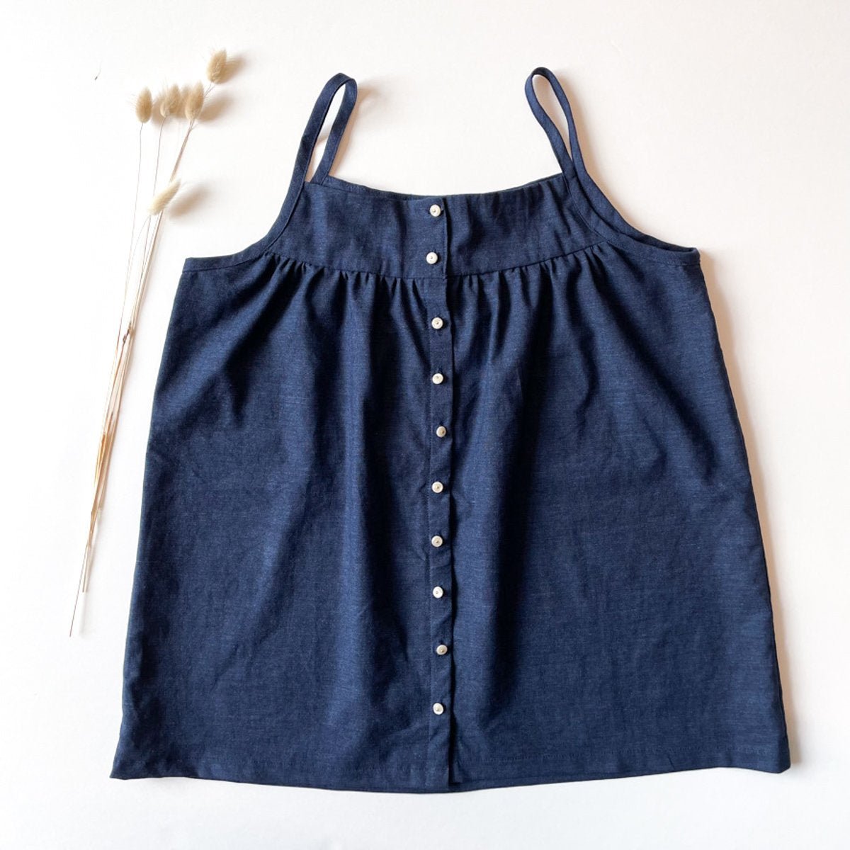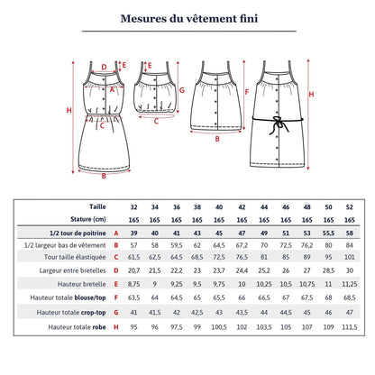 Thin shoulder straps or shoulder straps to tie (wider as an option).Front and back can be interchanged for multiple versions.Optional belted straight dress or with skirt and elasticized casing.Lined top yoke and gathered bottom.Long or short elasticated crop top.Optional buttoned or buttonless front.Optional small ruffles at the armhole.Can be worn over a tee-shirt.Outfit to be made in woven or jersey fabric depending on the look chosen.