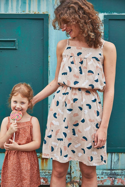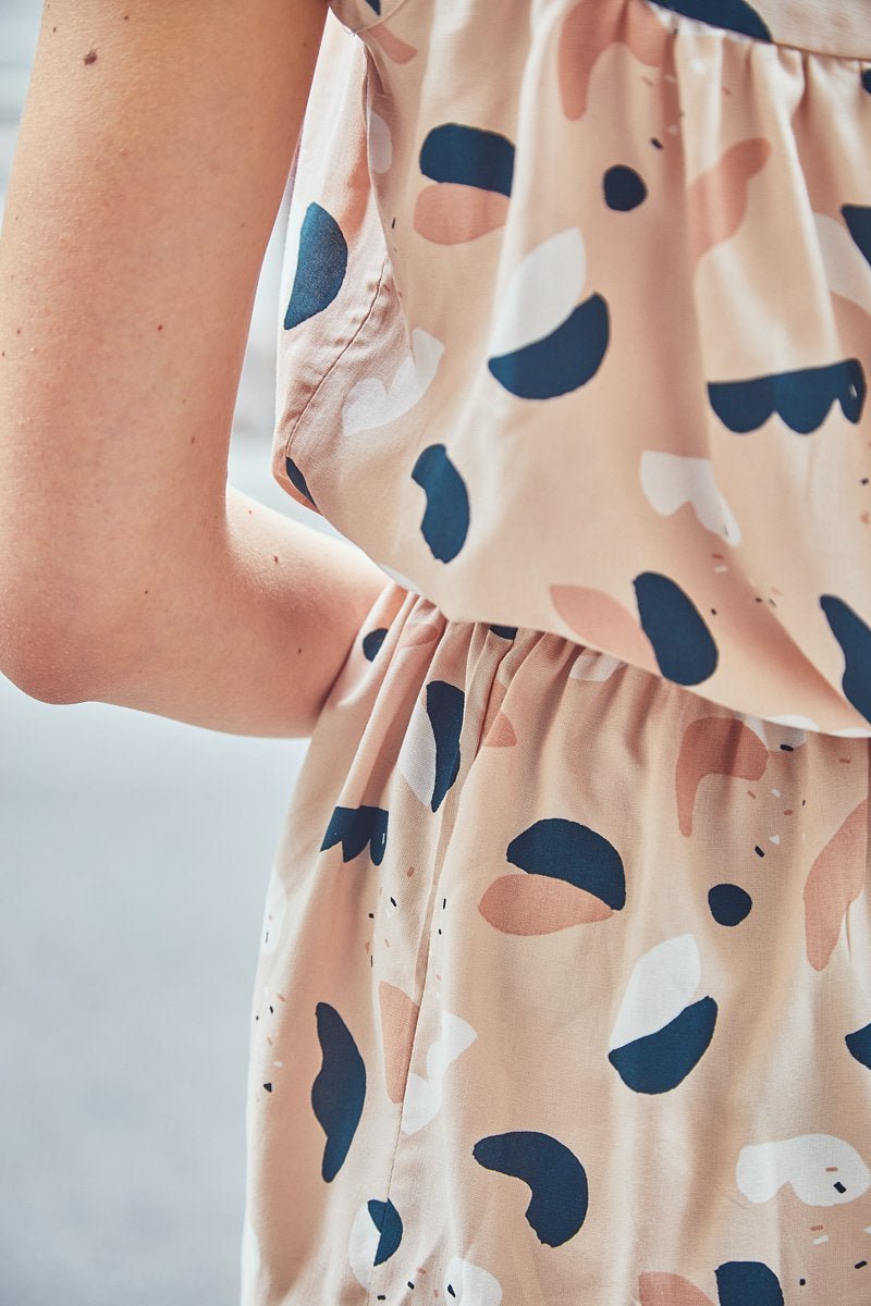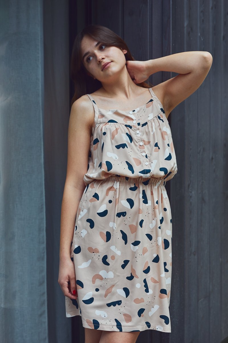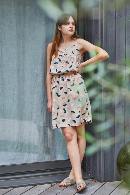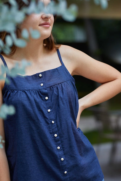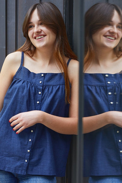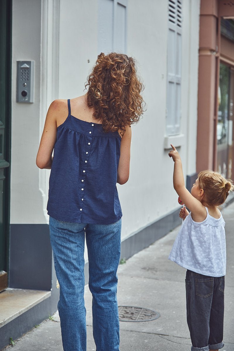 Thin shoulder straps or shoulder straps to tie (wider as an option).Front and back can be interchanged for multiple versions.Optional belted straight dress or with skirt and elasticized casing.Lined top yoke and gathered bottom.Long or short elasticated crop top.Optional buttoned or buttonless front.Optional small ruffles at the armhole.Can be worn over a tee-shirt.Outfit to be made in woven or jersey fabric depending on the look chosen.