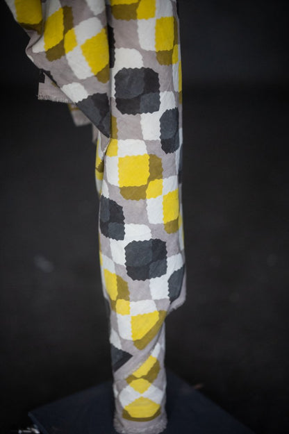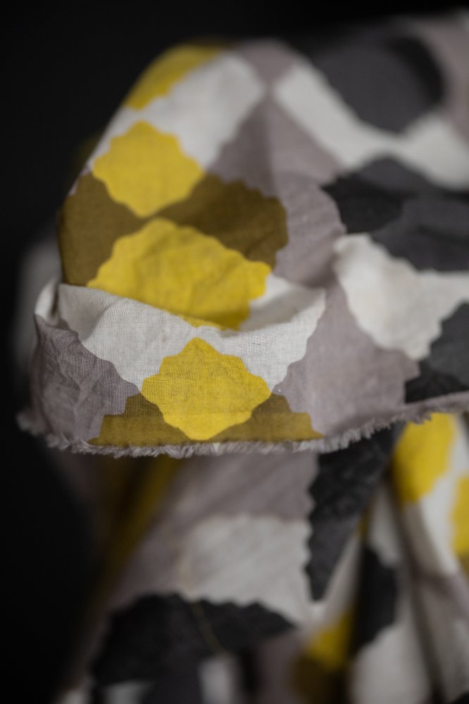 A bold geometric Indian block print in yellow, mid grey and charcoal.