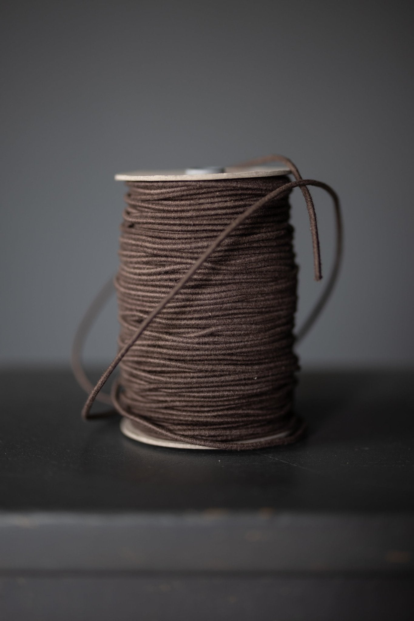 A soft recycled cotton cord elastic in warm brown. Perfect for bag making.Made in Italy.