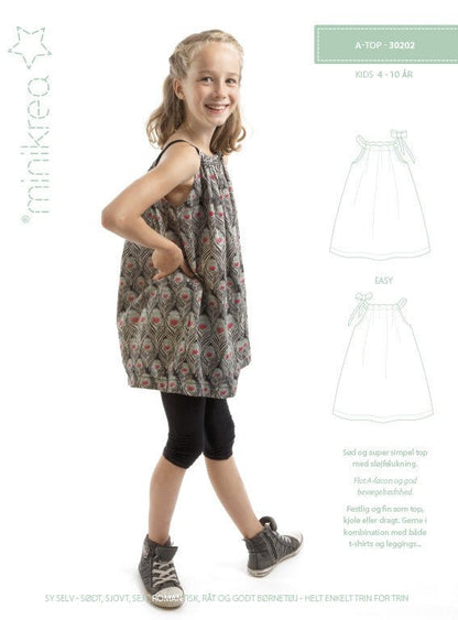 Super sweet, simple and fast to sew A-line top with adorable shoulder bow and unlimited variations. Use it as a summer top or make it a longer dress for elegant party wear. Make a simple suit or any of the other fun combinations. Make it with a large bow, thin shoulder ribbons, stylish pleats or with a fun bias tape edging...