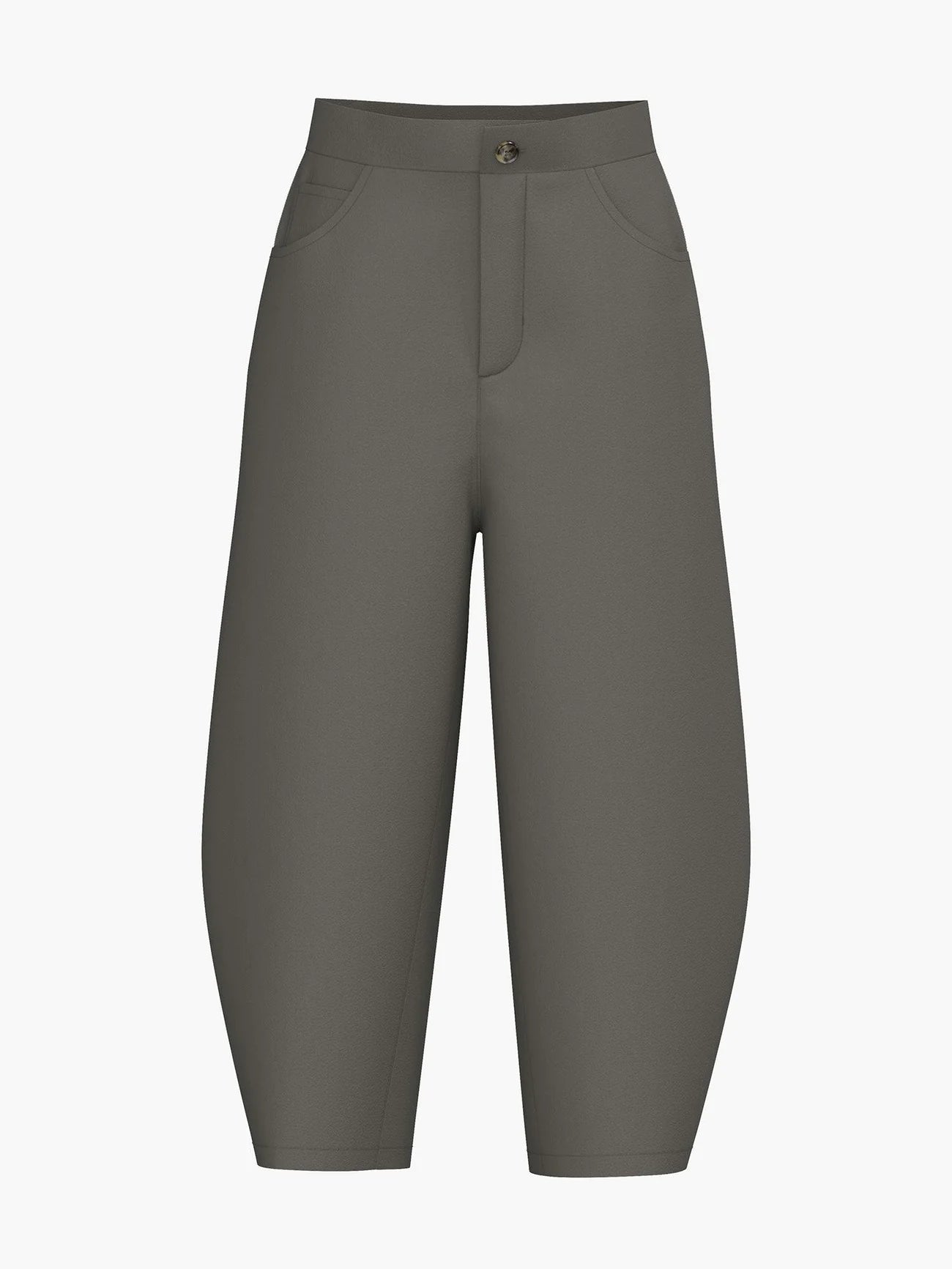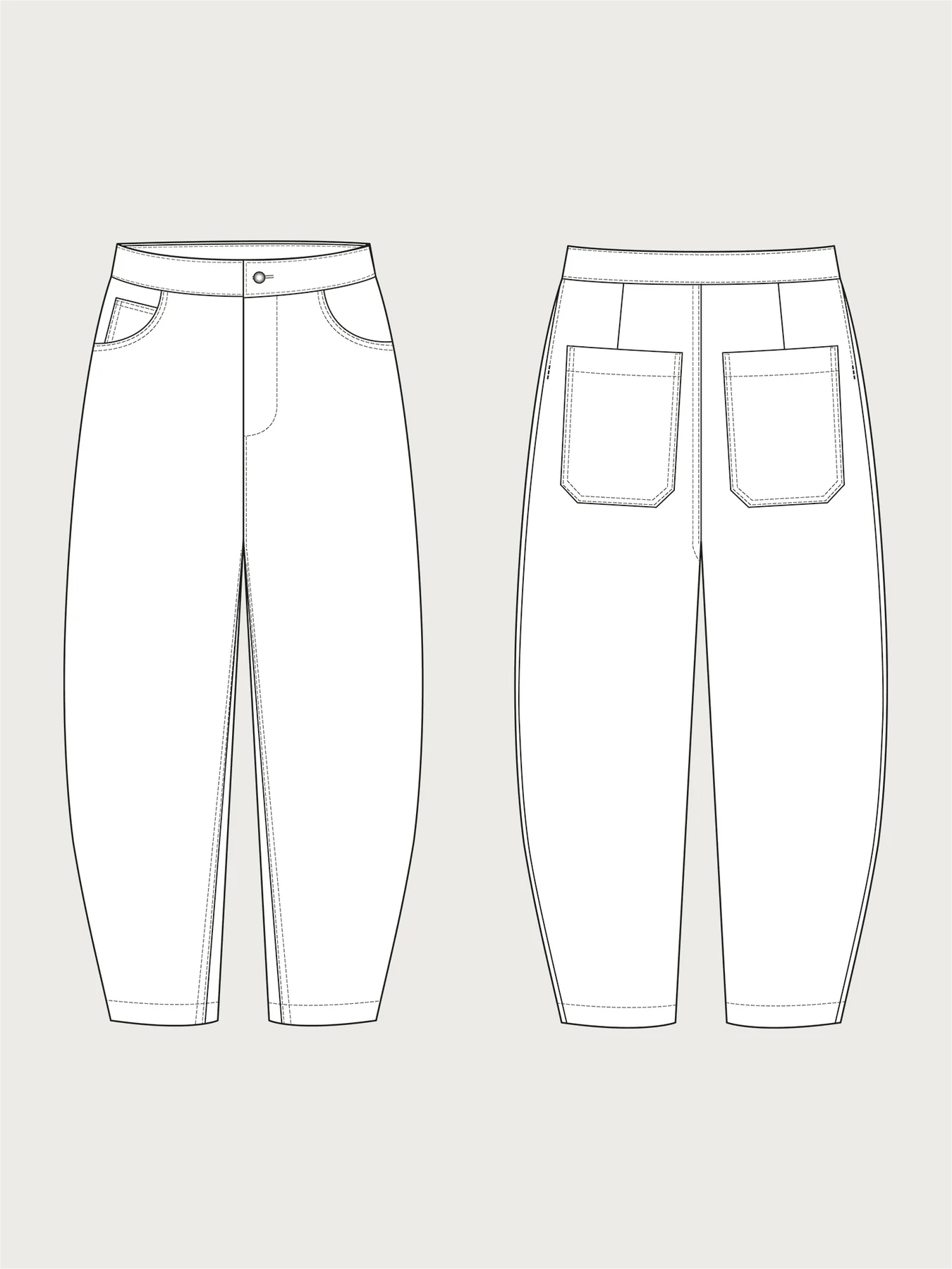 The Barrel-leg trousers boast a dropped crotch and a cropped, curved leg.