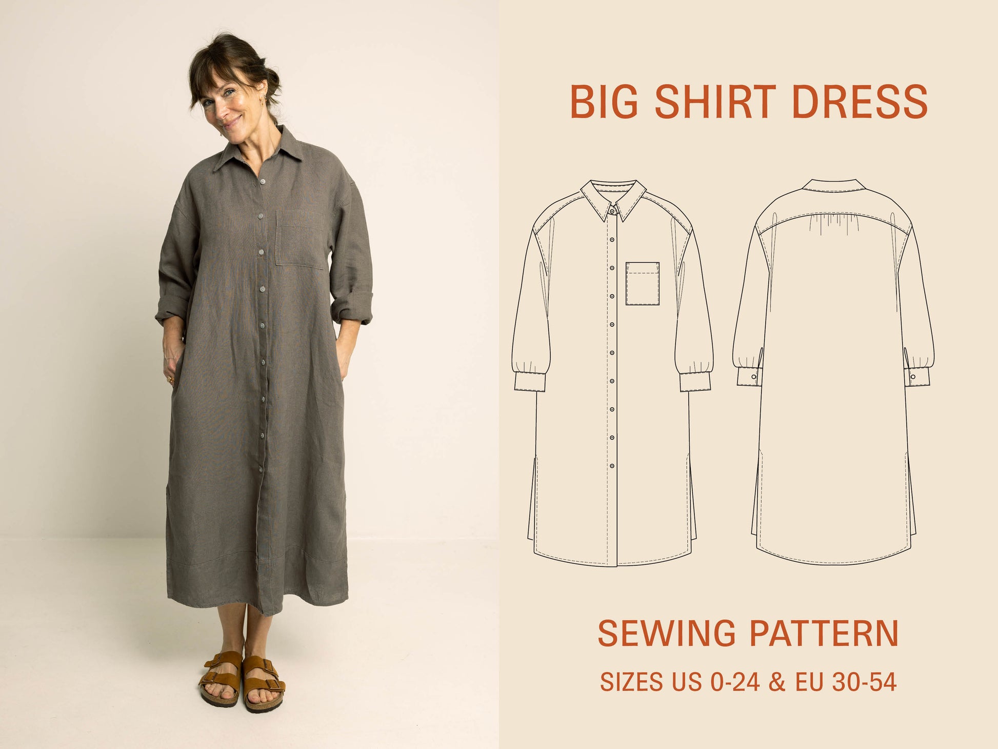 Effortlessly cool and endlessly versatile, the Big Shirt Sewing Pattern is designed for both a relaxed shirt and a stylish shirt dress. This oversized silhouette features a classic collar with a stand, dropped shoulders, and your choice of voluminous cuffed sleeves or elbow-length sleeves. The front showcases a button placket and side seam pockets, while gentle gathers at the back yoke add subtle shaping and detail.