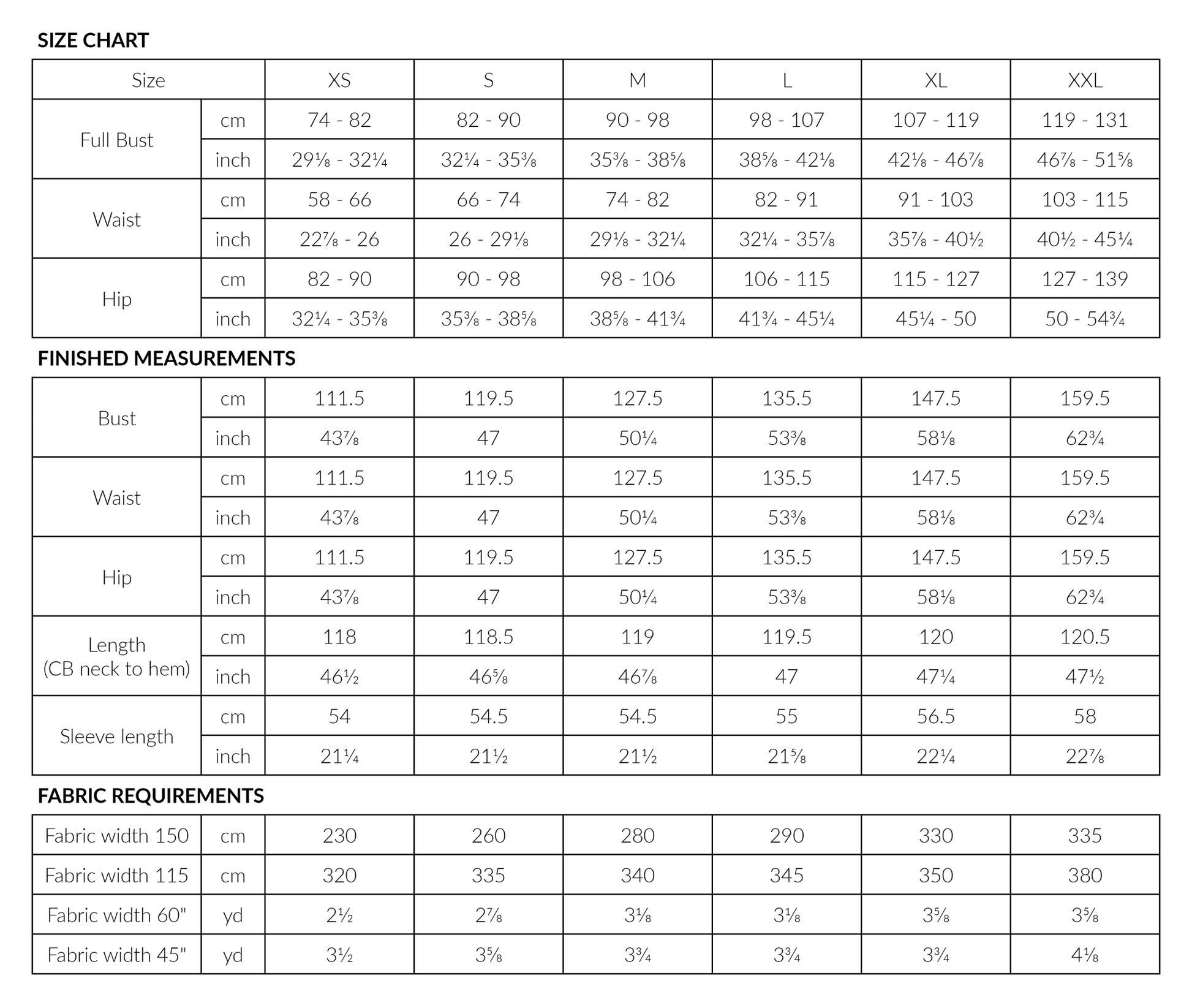 Size Unit XS S M L XL XXL Fabric width 150 cm cm 230 260 280 290 330 335 Fabric width 115 cm cm 320 335 340 345 350 380 Fabric width 60" yd 2 1/2 2 7/8 3 1/8 3 1/8 3 5/8 3 5/8 Fabric width 45" yd 3 1/2 3 5/8 3 3/4 3 3/4 3 3/4 4 1/8 Note that for patterned or napped fabrics the fabric requirement may be higher.