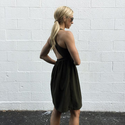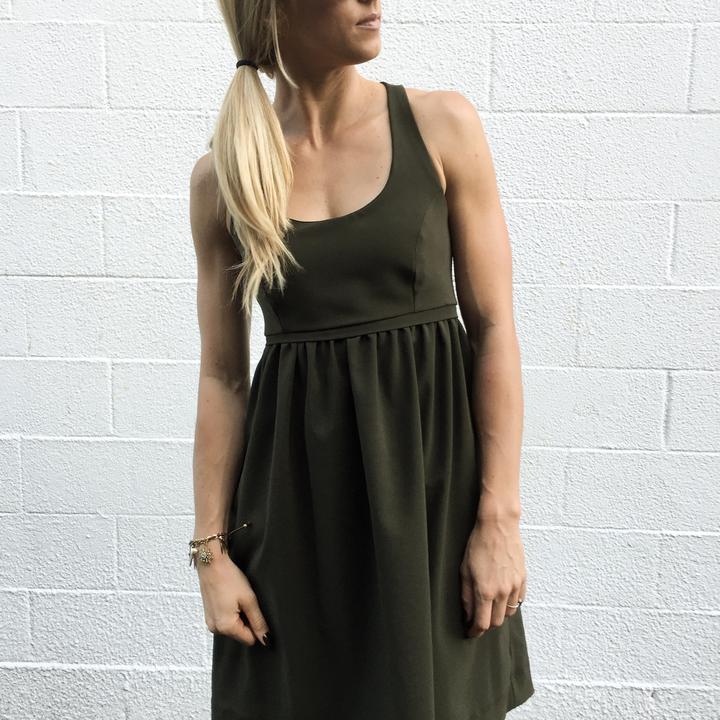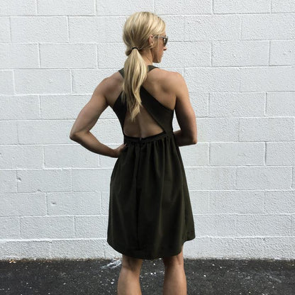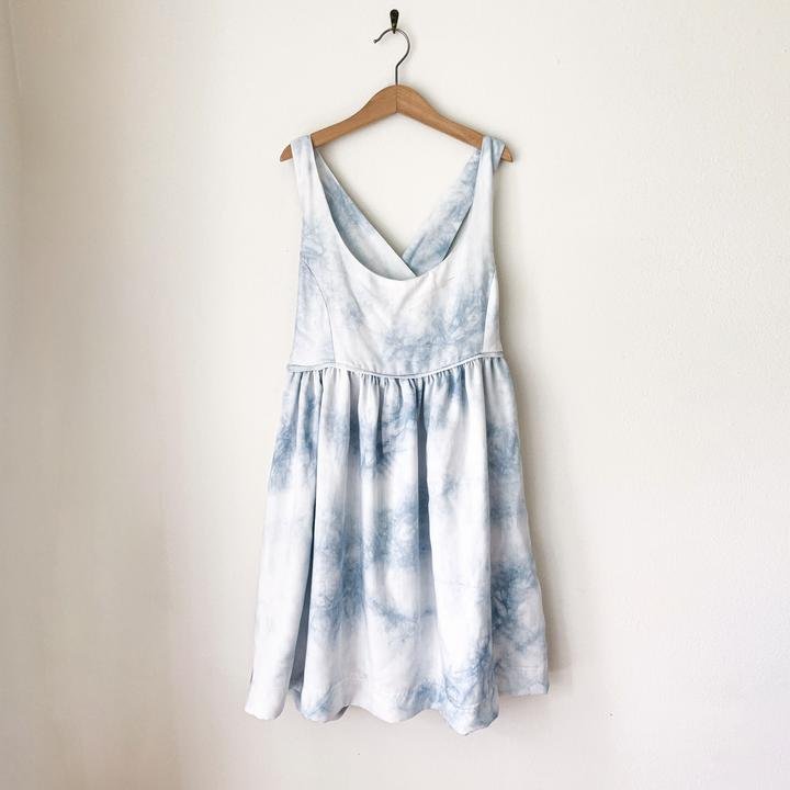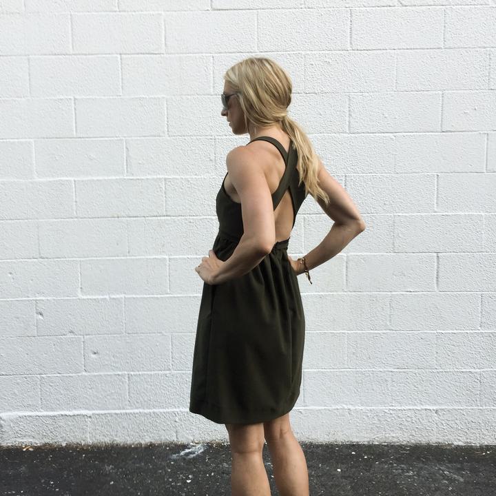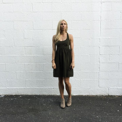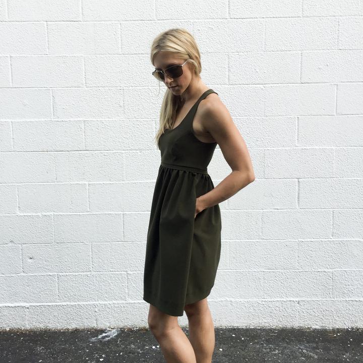 Fun facts. The midline sits at the natural waist. Scoop neck with slightly fitted bust line, criss cross back straps with gathered skirt and optional pockets! The back of the skirt closes with an invisible zipper. The hem line is intended to fall just above the knee but is customizable to your needs.