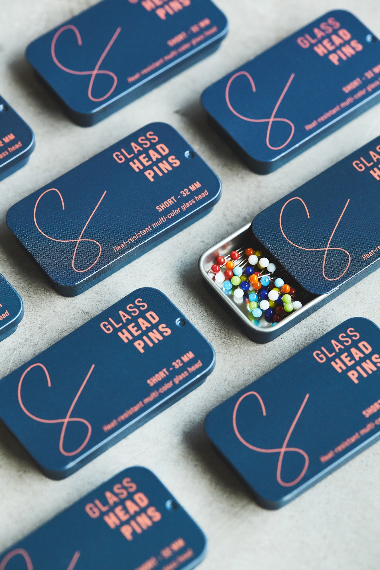 Stainless steel pins with heat-resistent multi-color glass heads.