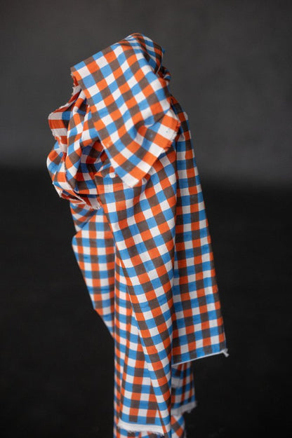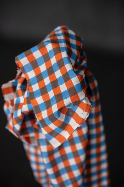 A vibrant checked Indian block print in bright blue and satsuma orange.