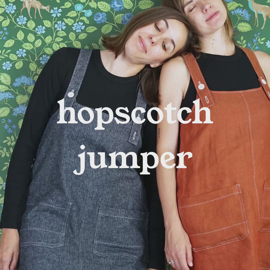 Style it with a fitted tee or puff sleeve blouse for an easy daytime look. Go cool-girl casual with a bralette or crop top, or take it into colder weather with a turtleneck, tights, and boots. However you wear it, the Hopscotch Jumper is all about having fun with your sewing and your style.