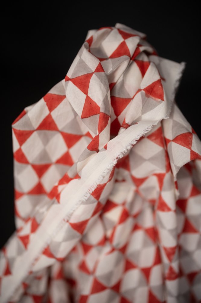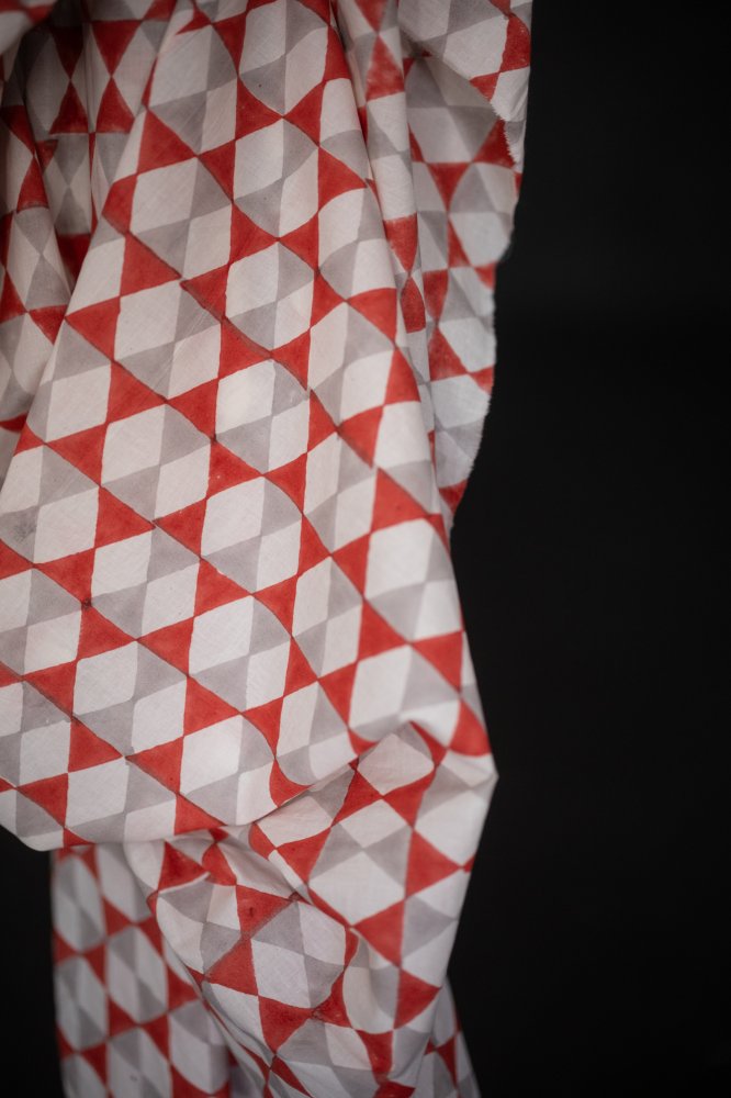 A bold geometric Indian block print in red and light grey.