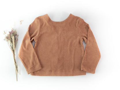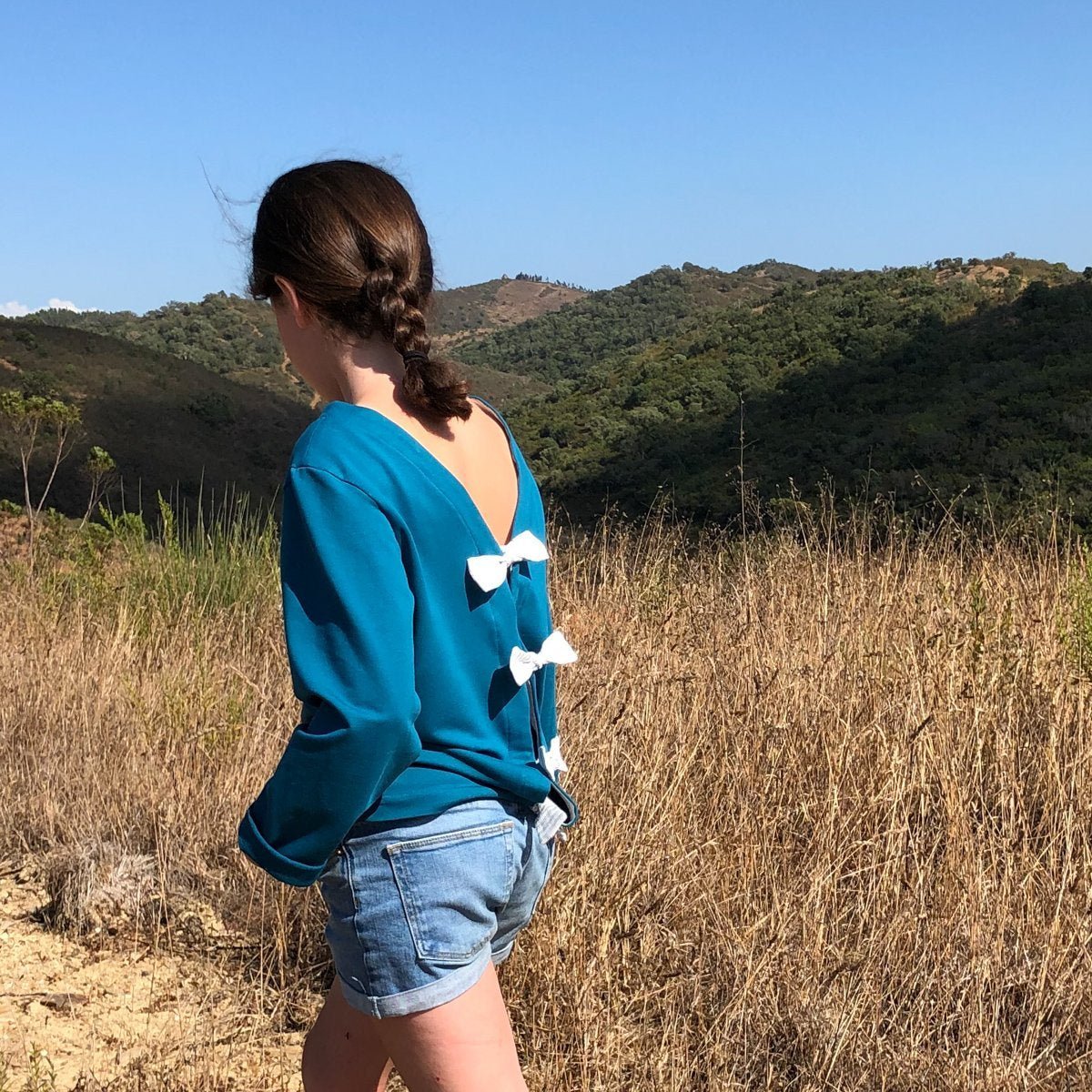 Cardigan or sweatert (or very loose tee-shirt) that can be worn either with front or back opening. Length: half hips (the waistcoat can be shortened at the hips... recommended for the version with bows in the back, the look will be nicer). Front or back V-shaped opening with bows, buttons and loops or zip. The cut allows you to put it on without opening the cardigan. Facing at opening and neckline. Bottom sleeves and body with hem. No pocket.